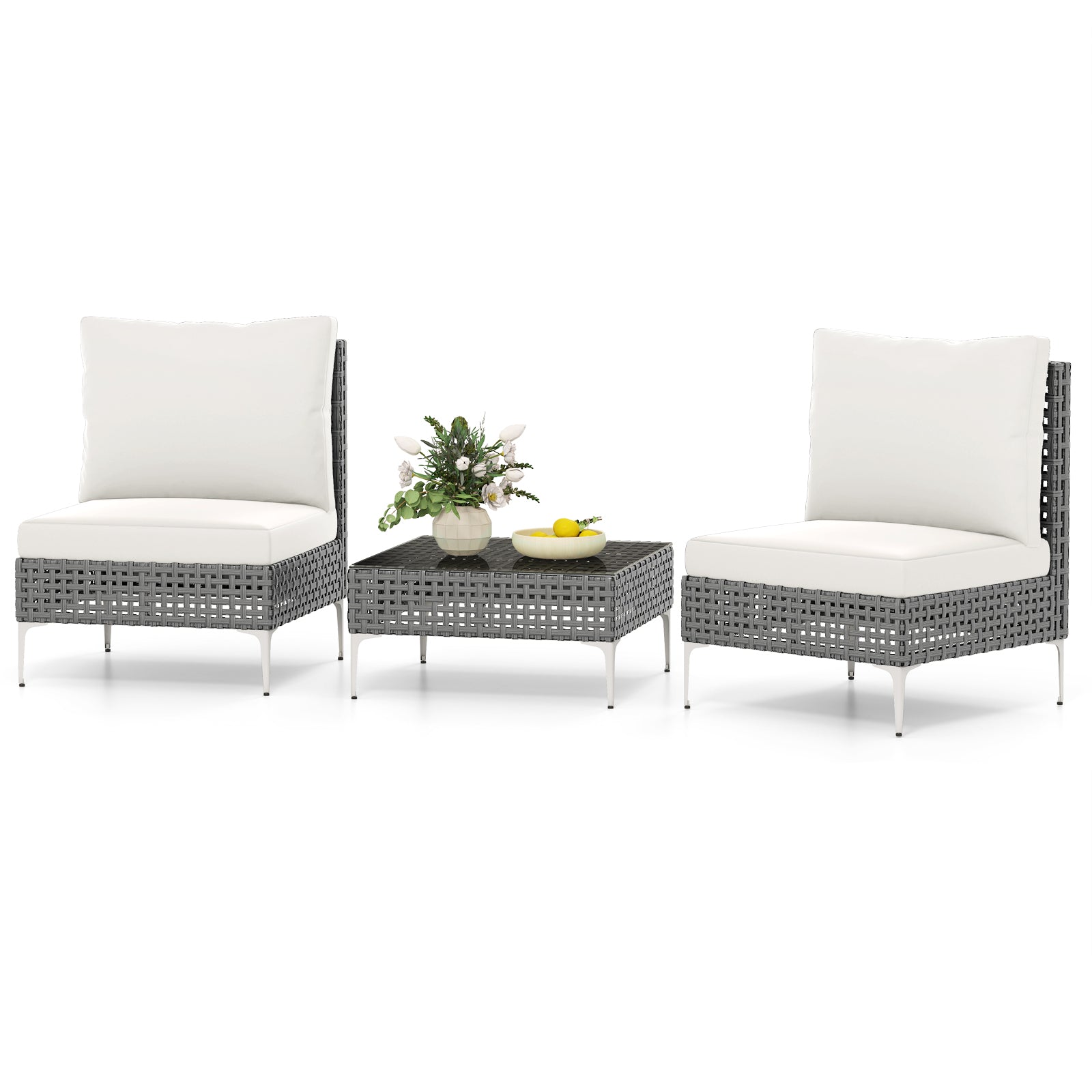 3 Pieces PE Rattan Conversation Chairs with Tempered Glass Coffee Table for Garden Porch-White