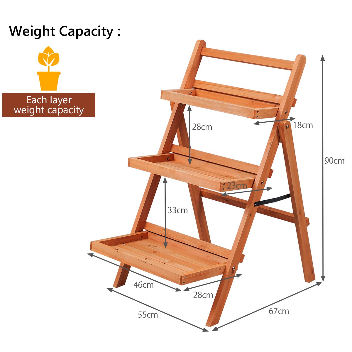 Solid and stable fir wood construction gives it strong support. Two metal hinges enable the leg frame to be more stable. Three-tier display shelves are not only wide enough to load your potted plant but also protect them well from falling down. The foldable feature will help you greatly save storage space. Looking simple and natural, it will be a perfect display stand for your home! Solid and Long-lasting Wood Frame: Durable and environmentally friendly fir wood constitutes this construction which is sturdy enough to steadily stand and support the shelf and stuff put on it. Tow metal hinges closely connect the front with the rear leg base and stably stabilize them. Easy Storage and Space Saving: The complete design of this shelf is compact and convenient to store and display. It can be stored in folding form which helps you largely save room space. Spacious Space for Display: The stand totally has 3 tiers and is presented in ladder form so each tier will never cover up with each other and full display stuff on it. The edge of each tier is high and thick enough to prevent decorative stuff it falling down. No assembly and easy maintenance: These plant racks can be put into use without assembly, saving you time. Moreover, the smooth and waterproof wooden surface can be easily wiped clean with a damp cloth, making it easy to maintain. Multifunction and Indoor/Outdoor Usage: This 3-tier display stand is perfect for indoor and outdoor use because of its displaying and practical storage function. It can be organized and decorated with any variety of objects like potted plants, picture frames, books and candles etc.