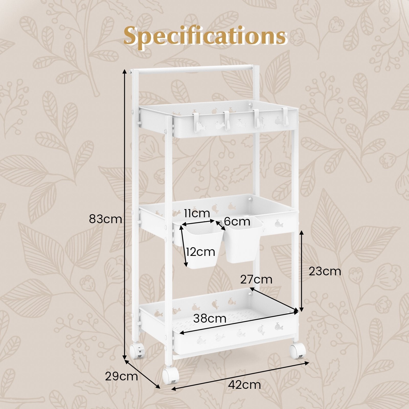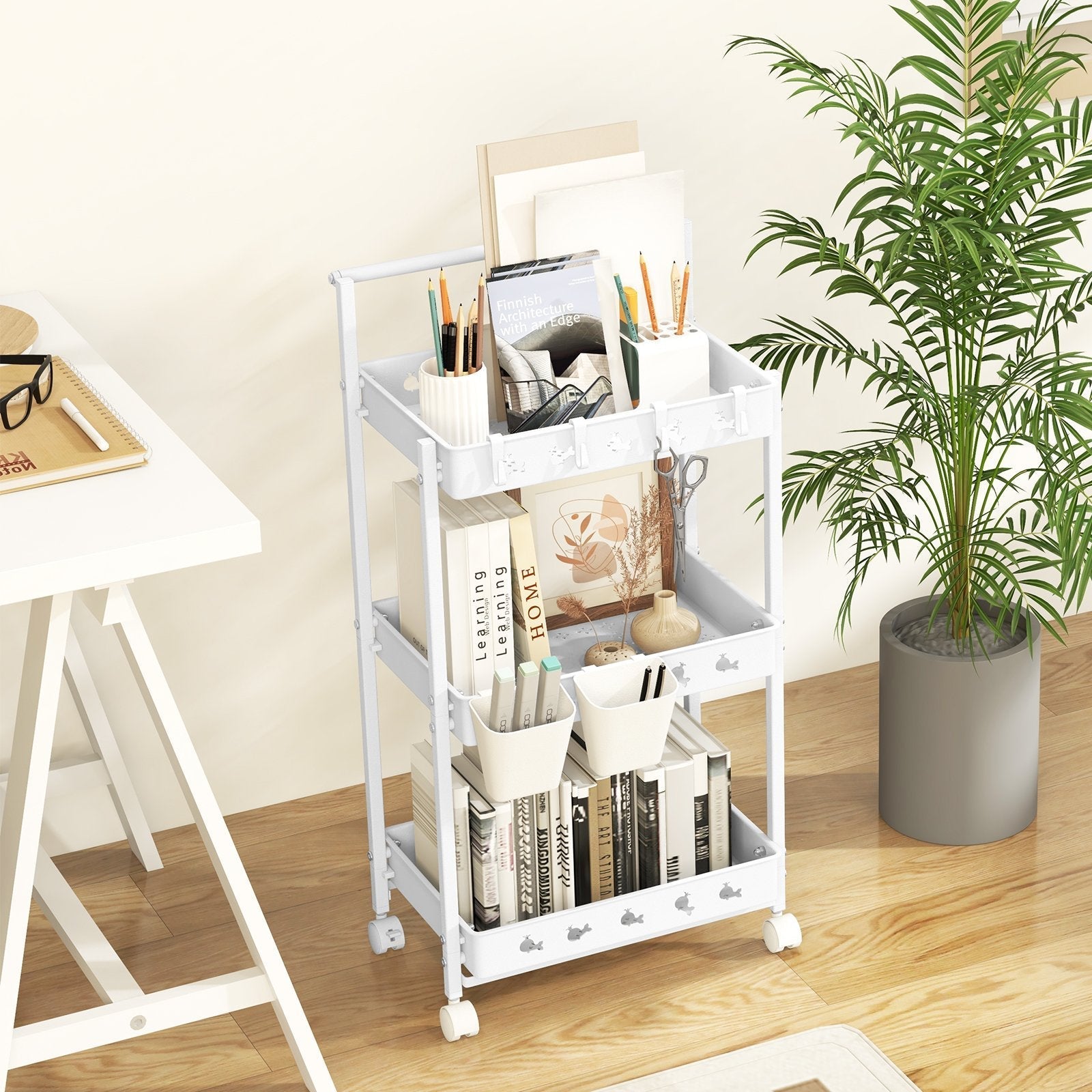 3-Tier Rolling Storage Cart with 2 Hanging Cups and 4 Hooks-White