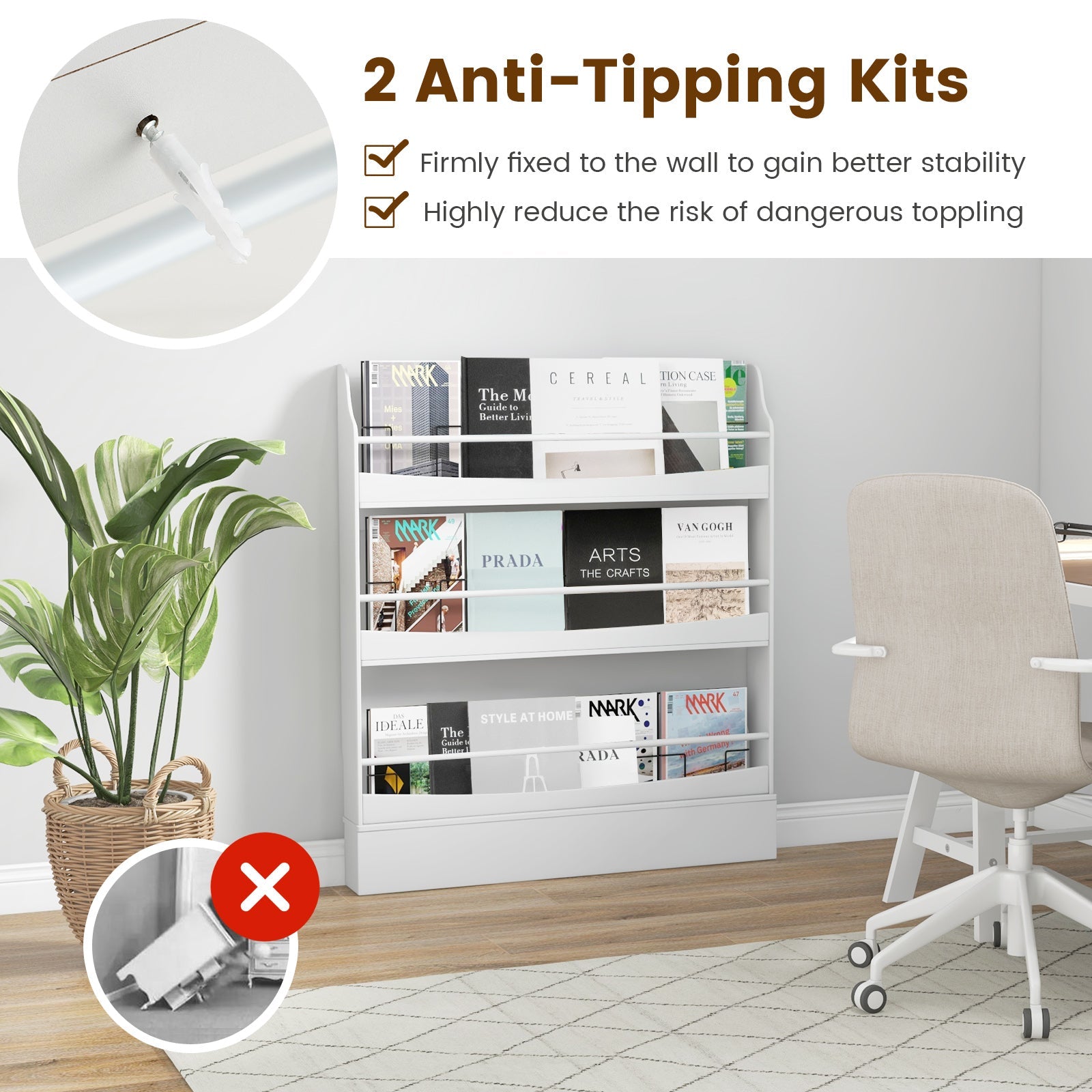 3-Tier Standing Bookshelf with 2 Anti-Tipping Kits and Guardrails-White