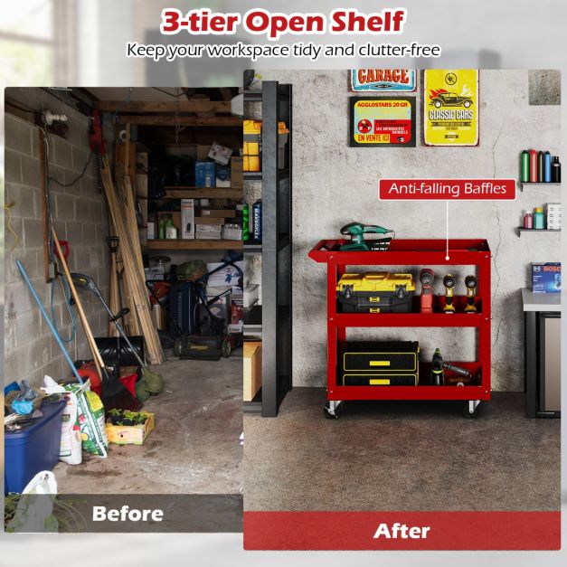 3-Tier Tool Trolley with Handle and Lockable Wheels-Red