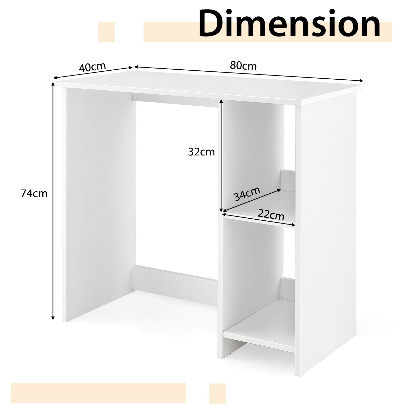 Colour: White Material: Engineered Wood Overall Dimension: 80 x 40 x 74 cm (L x W x H) Size of Each Compartment: 34 x 22 x 32 cm (L x W x H) Leg Room Dimension: 52 x 72cm (L x W x H) Clearance from Bottom Shelf to Ground: 6 cm Load Capacity of Desktop: 90 kg Load Capacity of Each Compartment: 20 kg Net Weight: 14 kg Box Qty:1(May vary by batch)Package Includes: 1 x Small Computer Desk 1 x Instruction Manual