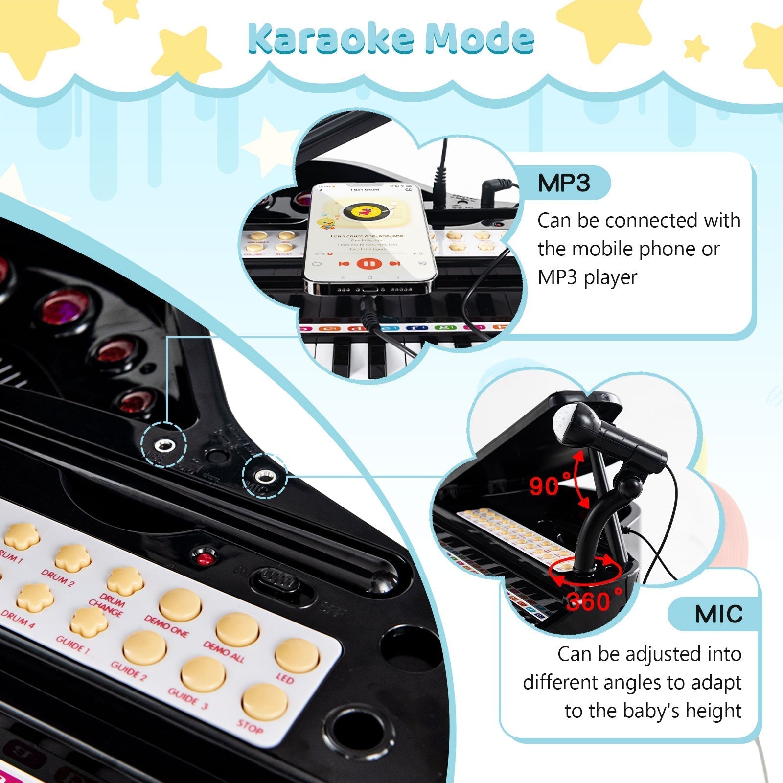 -Premium keys with LED lights and cute stickers for fun-Freely rotatable microphone for singing practice-MP3 interface for connection with electronic devices-Record and play functions to meet personal needs-22 demo songs and LED teaching mode for quick learning-4 musical and accompaniment styles for different experiences-8 percussion effects and 4 instrument tones for varying needs-Volume adjustment and speed control for different requirements-Selected materials with stable construction for long-lasting use-Non-slip foot pads for added stability and floor protection-Ideal educational gift for children aged 3+ years old-ASTM and CPSIA certifications for more reliability