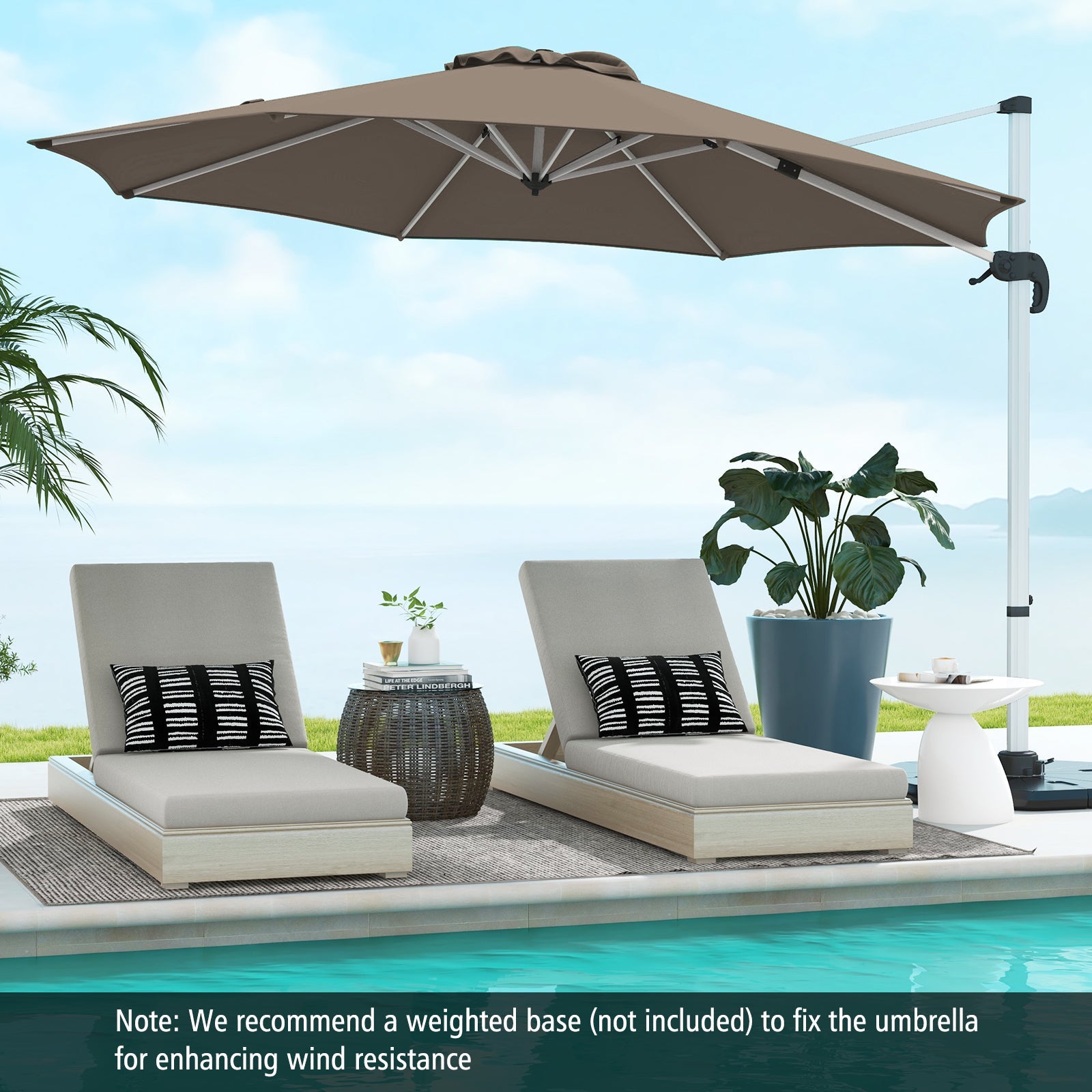 Our outdoor patio umbrella measures 325 x 261 cm (Dia. x H), providing an expansive shade area for various outdoor activities, whether it's a bustling commercial area or a cozy backyard retreat. With the ability to rotate a full 360° effortlessly and adjust the tilt angles in 5 positions, you can enjoy the optimal shade throughout the day. Other than that, the canopy is crafted from 100% new yarn-dyed polyester fabric, which is UPF50+ sun-protective and 3-year fade-resistant, ensuring long-term outdoor use. To enhance its wind resistance, the offset umbrella boasts a thick aluminum pole and 8 heavy-duty ribs, which is built to withstand the elements. And thanks to the convenient crank handle, you can effortlessly open or close your umbrella. Note: We recommend a weighted base (not included) to fix the umbrella for enhancing wind resistance. Spacious Coverage: This round outdoor patio umbrella features an impressive 325 cm diameter, providing a large shading area for various commercial and residential settings, such as poolsides, yards, gardens, coffee shops, and more. It includes a robust crossed base and we recommended a weighted base (not included) to fix the umbrella for enhancing wind resistance. 360° Rotation and Adjustable Tilt: This cantilever umbrella is equipped with a convenient foot pedal, allowing for seamless 360° rotation. And there are 5 adjustable tilt angles, which is easy to adjust by moving the crank handle up and down. It could provide you with optimal shade throughout the day. Premium Quality Fabric: The offset umbrella canopy is crafted of premium 250 GSM yarn-dyed polyester fabric, guaranteeing superior UPF50+ sun protection and wear resistance for long-term outdoor use. Moreover, it could resist fading for up to 3 years, maintaining its vibrant hues. Sturdy & Stable Construction: Being supported by a thick aluminum umbrella pole and 8 heavy-duty ribs, this umbrella provides robust support. And the metal frame surface is coated with rustproof paint, ensuring long-term outdoor use. Moreover, the top features reinforced triangular structure for helping stabilize the umbrella during windy conditions. Effortless Operation: This round cantilever umbrella adopts a hassle-free crank handle, making it easy to open and close the umbrella by rotating it. And there is a convenient loop strap to secure the umbrella into a compact size when not in use. Note: We recommend folding and covering it to prolong its lifespan in nighttime or under extreme weather conditions.