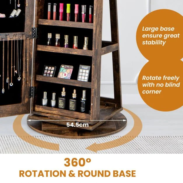 360-Degree Mirrored Jewelry Armoire with 3-Color Auto-on LED Lights-Rustic Brown