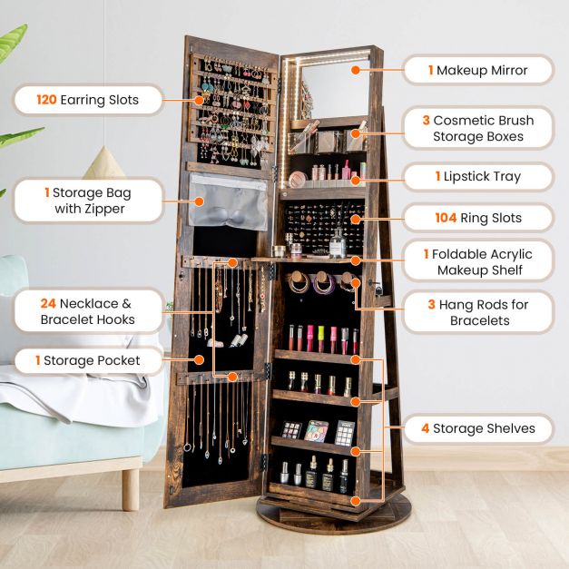 This jewelry cabinet is built with a full-length mirror, a large inside storage space and storage shelves on the back, making full use of the limited space. And the inside space is divided into lots of storage partitions with hooks, slots and more, which helps you organize jewelry and cosmetics well. The base is 360° rotatable so you don’t need to be worried about taking items on the back storage shelves. More importantly, the mirror inside the cabinet is equipped with LED lighting that features 3 adjustable colors. And the folding acrylic table is convenient for placing makeup tools. The cabinet door is lockable with the included keys if needed. Made of premium MDF material, the stability and durability of this freestanding jewelry organizer is assured. If you are looking for such a product, do not hesitate to buy it! 3-in-1 Multi-use Jewelry Cabinet: This freestanding jewelry cabinet combines a full-length mirror, jewelry and makeup organizer and storage shelves, meeting your different needs. Its compact size and simple style is easy to fit into your existing home decorations and increase the space efficiency of limited spaces like apartments. Large Storage Space with Classification: The jewelry cabinet offers ample space and is designed with slots, storage bag, hooks, storage compartments, hanging rods and storage shelves for your jewelry, cosmetics and more. Outside the cabinet, the 2-tier storage shelf can be used to place shoes and handbags. Built-in Makeup Mirror and LED Lights: The inside space is equipped with a mirror and a folding acrylic table, which is convenient for making up or trying on. In addition, the LED lights will automatically turn on when you open the door, which brights up your beauty in the dark. Also, the LED light features 3 adjustable colors for you to choose. 360°Rotating and Lockable Design: The base of the jewelry cabinet is 360° freely rotatable, allowing you to find the desired angle or get access to the storage shelves effortlessly. Moreover, the cabinet door is lockable and 2 keys are included, which keeps your jewelry and makeup away from children. Reliable Structure and Easy Assembly: Made of P2 grade MDF material premium steel hinges, the rotating jewelry armoire is built for long-lasting use. The large round base is not easy to be turned over, adding additional stability during use. The assembly is easy and quick with detailed instructions.