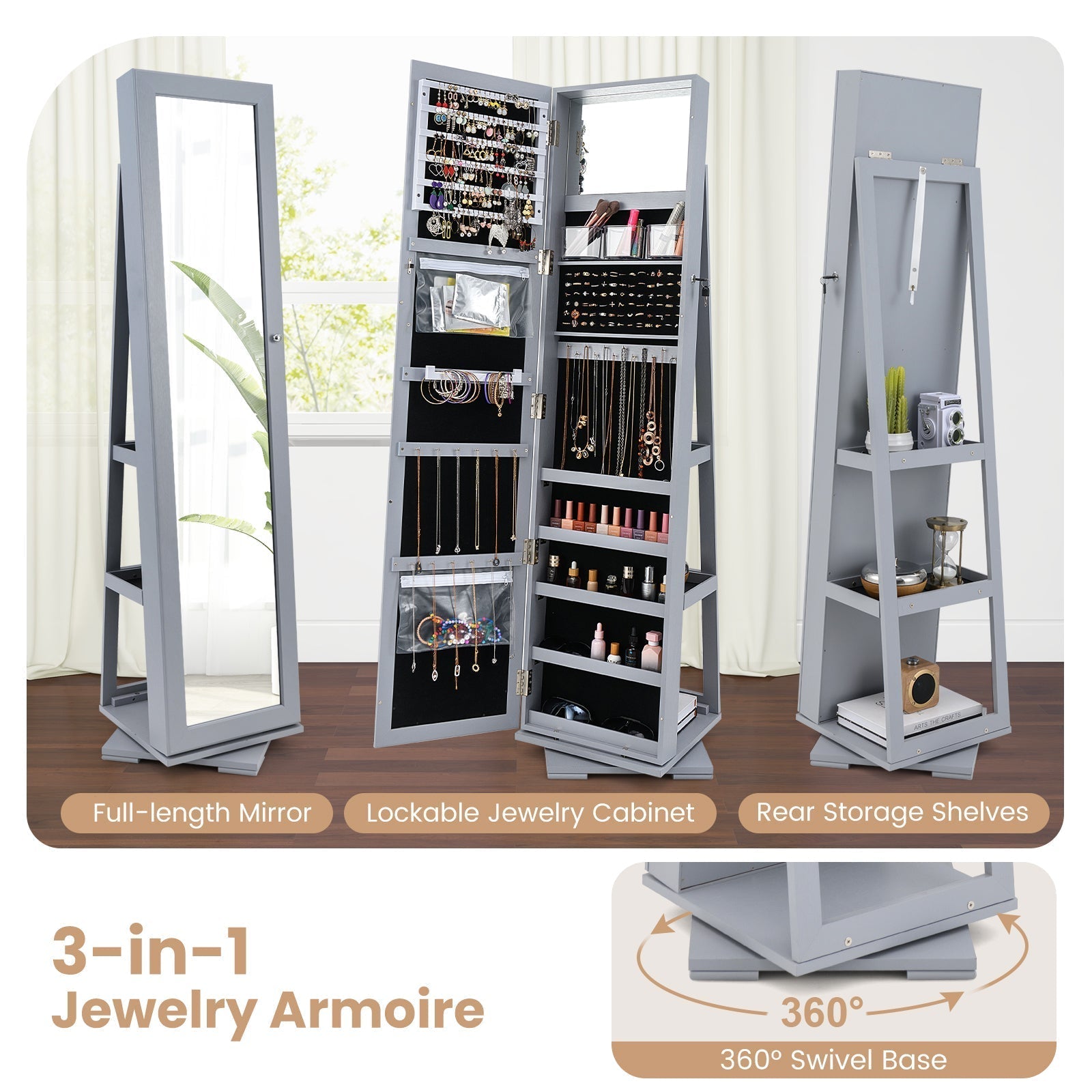 360° Rotatable 2-in-1 Lockable Jewelry Cabinet with Full-Length Mirror-Gray