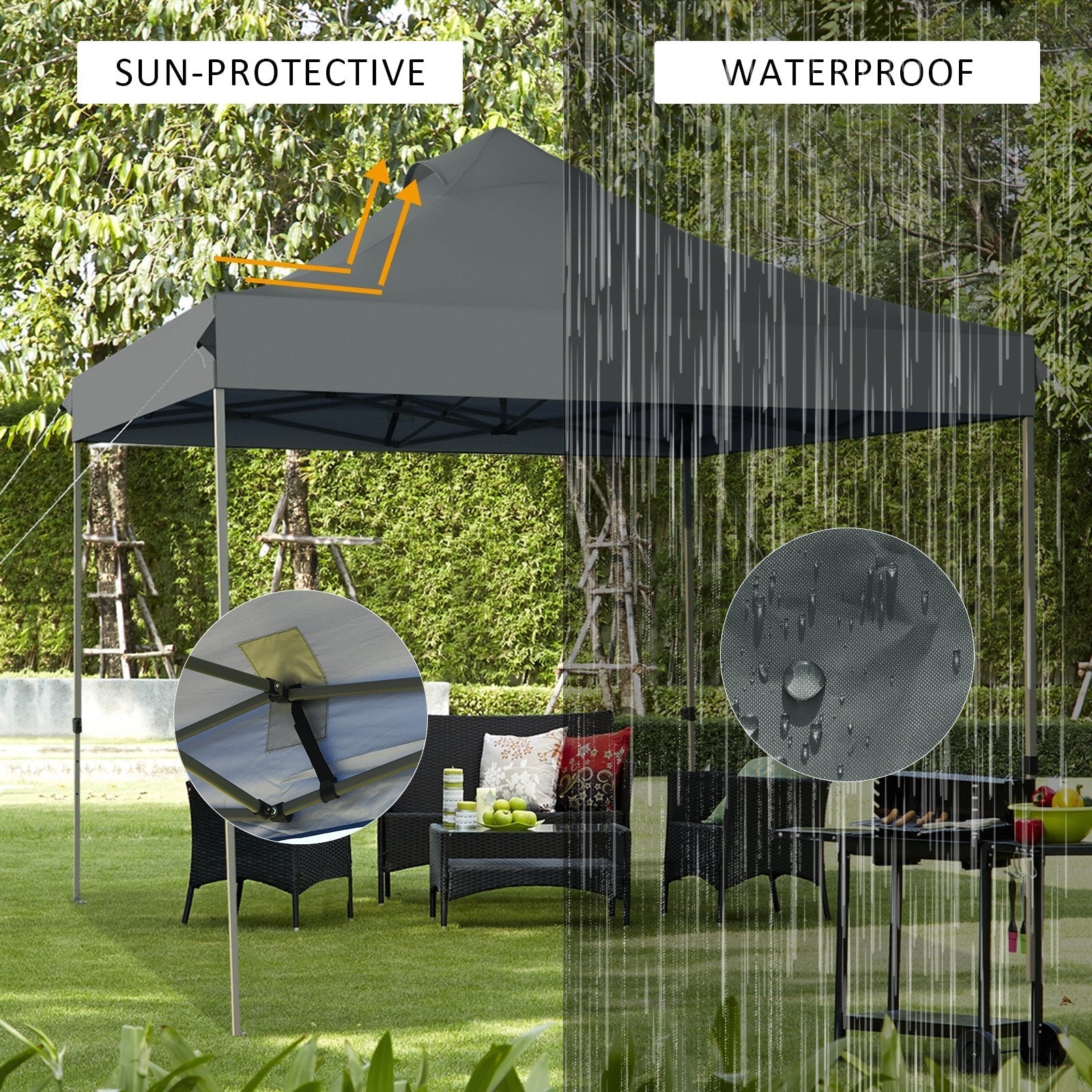 Are you looking for a stable and durable canopy to provide shelter for your outdoor activities? The 3m x 3m folding canopy tent will be your best choice! The canopy is made of 300D silver-coated oxford cloth, which can protect you from the sun and rain. The powder-coated steel frame is sturdy and not easy to rust to withstand long-term use. With a shade area of 9 square meters, this folding canopy is suitable for picnics, parties, trade shows and other outdoor activities. It's worth mentioning that this canopy has 3 height settings to choose from, and the no-pinch buttons allow you to easily lock the legs at desired height without damaging fingers. In addition, equipped with a wheeled storage bag, this folding canopy can be carried to the beach, park, tailgate, etc. All-weather Protection: Made of high quality silver coated 300D oxford cloth, the awning cover can effectively block the scorching sunlight. Stitching lines are all seam sealed to prevent tearing and water penetration. Whether it's sunny or rainy, this folding canopy tent can provide you with reliable shelter. Sturdy Frame with Adjustable Height: The powder-coated steel frame provides stable support while preventing rust. Each canopy is equipped with guy ropes and ground spikes to better resist strong winds. In addition, the no-pinch push buttons allow you to freely adjust the leg height in three settings of 3.05m, 3.20m and 3.35m according to different needs. Large Shade Coverage: This 3m x 3m folding canopy tent provides 6-8 people with 9 square meters of shading area. You can place tables, recliners and rattan conversation sets under the canopy to enjoy leisure time. It is ideal for outdoor activities such as parties, picnics, trade exhibitions, etc. Simple and Fast Set-up: Equipped with a clear user manual, this canopy can be easily set up in a short time without any tools. All you need to do is to unfold the pre-assembled steel frame first, then fix the canopy cover with hook and loop fasteners attached, and finally adjust the height for preferred shade coverage. Convenient Storage and Carrying: This pop-up canopy tent can be easily folded into a compact size and fits into the trunk of most cars. In addition, the wheeled carry bag makes it easier for you to take the canopy to the beach, tailgate, park and other places.