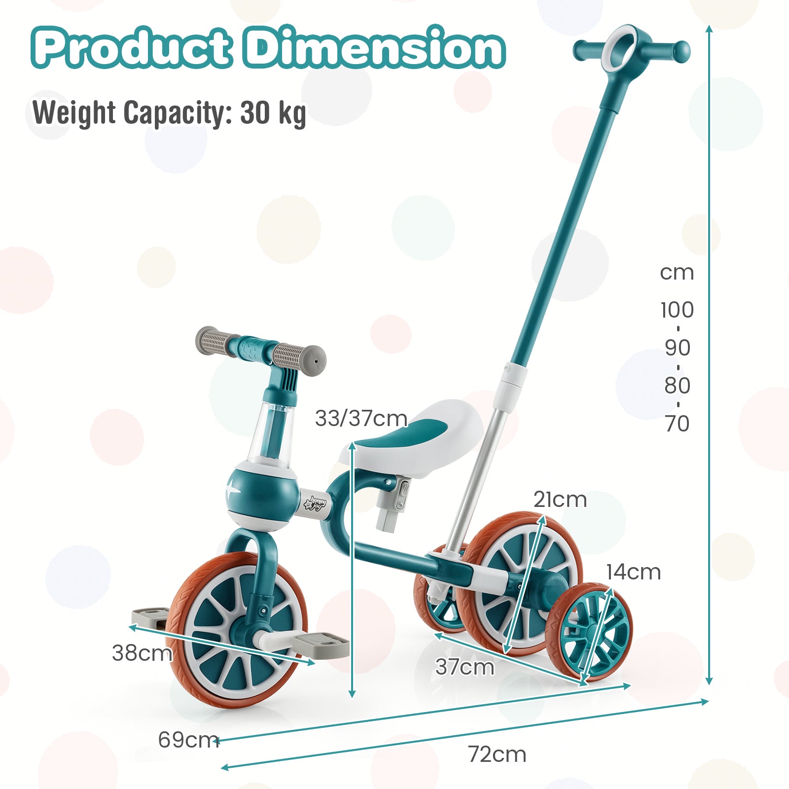 Colour: Navy/Pink Material: Carbon steel, EVA Overall dimension: 37 x 72 x 101 cm (L x W x H) Adjustable height of parent handle: 71/81/90/101 cm Adjustable height of seat: 33/37 cm Net weight: 3.5 kg Weight capacity: 30 kg Recommended age: 2 - 4 Years Old Box Qty:1(May vary by batch)Package includes: 1 x Kids tricycle 1 x Instruction manual