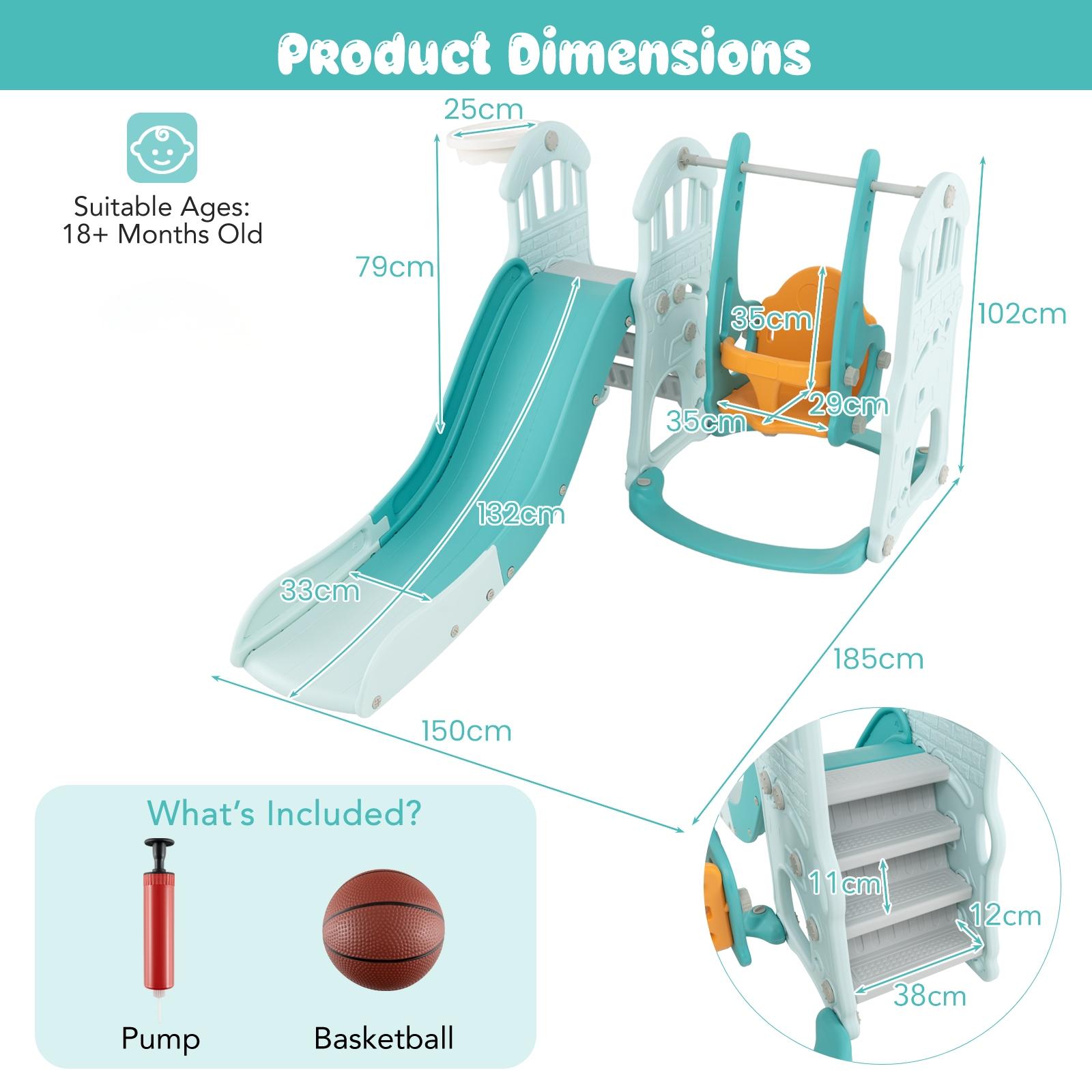 Colour: Green+Orange Materials: PP, PE Product Dimension: 185 x 150 x 102 cm (L x W x H) Size of Slide: 132 x 33 cm (L x W) Size of Each Stair: 38 x 12 cm (L x W) Size of Swing Seat: 35 x 29 cm (W x D) Backrest Height of Swing Seat: 35 cm Inner Diameter of Basketball Hoop: 25 cm Height from Ground to Swing Seat: 29/34/40 cm Height from Ground to Basketball Hoop: 79 cm Net Weight: 15 kg Weight Capacity: 30 kg Suitable Ages: 18+ Months Old Box Qty:1(May vary by batch)Package Includes: 1 x Toddler Slide Set 1 x Basketball 1 x Pump 1 x Instruction