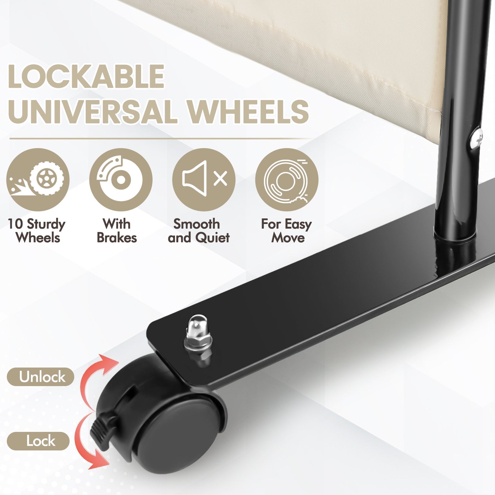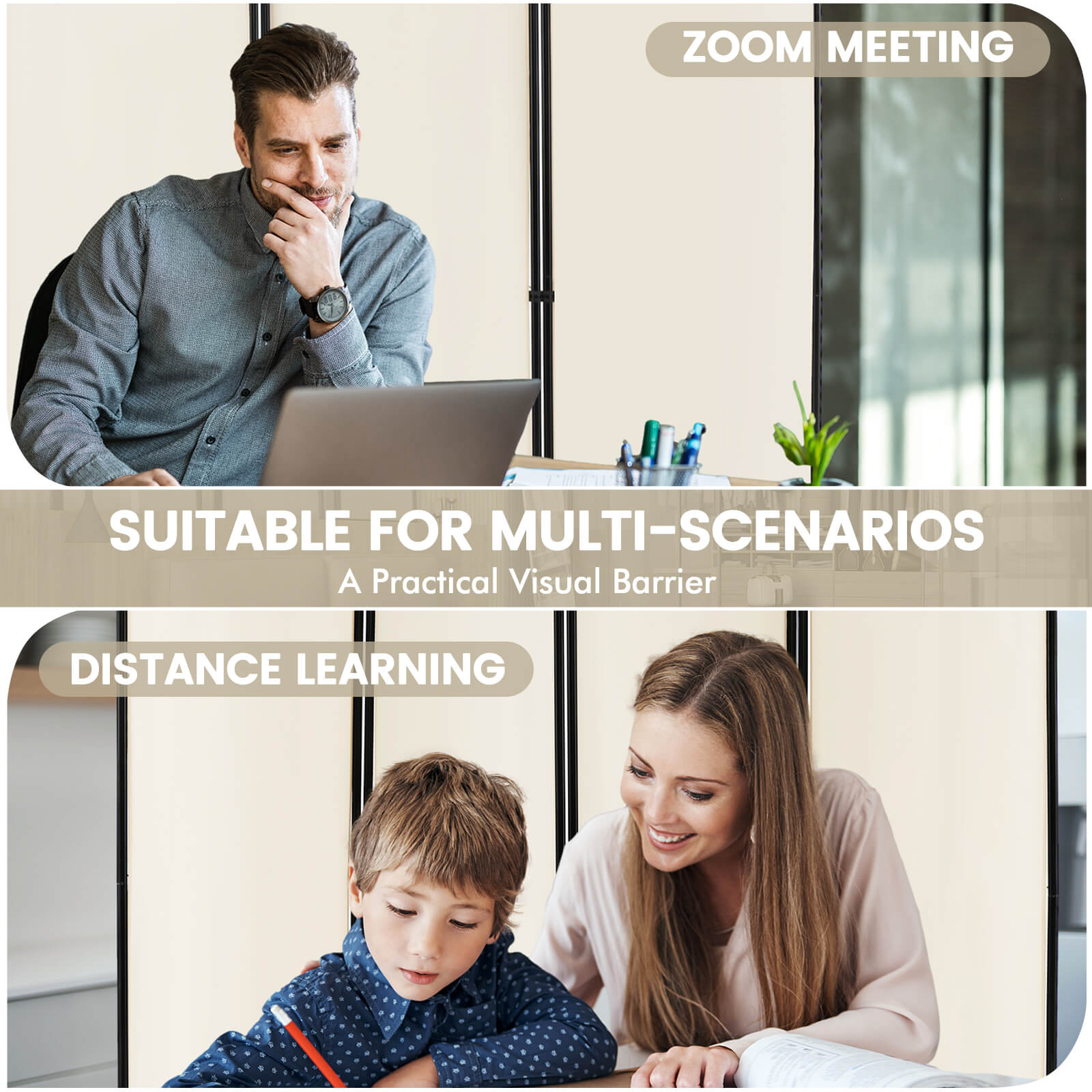 Looking for a room divider that's easy to move around? Check out this great 4-panel privacy screen! The frame of the folding room divider is made of sturdy metal for good stability. In addition, the surface of the room screen divider is made of breathable fabric, which is wear-resistant and will not transmit light. Meanwhile, the room divider comes with ten lockable universal wheels, allowing you to move it freely. Each panel can be used individually or combined together with connecting clasps for easy storage or transportation. If you are looking for a room divider like this, do not hesitate to place an order! 4-Panel Room Divider: This folding room divider consists of 4 panels that together are 260x180cm(3 Panel)/224x172cm(4 Panel). No matter where you are, you can create a private space when you unfold the panel screen. Its large screen allows you to isolate yourself from the unavoidable distractions in public areas so you can focus on your work or study. Lockable Universal Wheels: This office wall partition has 8/10 universal wheels that allow you to move the privacy screen anywhere without difficulty. 4cm wide casters provide better stability and weight-bearing capacity. In addition, the wheels of the room screen are equipped with brakes, so you can lock the wheels to secure the panel room divider. Folding Design for Free Combination: You can use this portable screen divider as 4 single units, or you can connect them with the included connecting clasps to form a large one. The folding screen can be folded 360 degrees or flexibly arranged into various shapes according to your personal needs: such as L-shaped, W-shaped, C-shaped, etc. Durable Material: The panels of this privacy separator with wheels are made of high-quality polyester fabric, which allows air circulation without letting light in. The frame and base made of metal are strong enough and rust-proofed for long-lasting use. Moreover, both the screen and the frame are detachable for easy storage. Wide Range of Applications: Apart from being used as a partition in the living room or bedroom, our privacy divider with wheels also has a wider range of uses. You can place the room divider next to a window to block the sun, and you can also create a temporary privacy space for overnight guests. It is also a practical and easy-to-set-up background for remote video conferencing.
