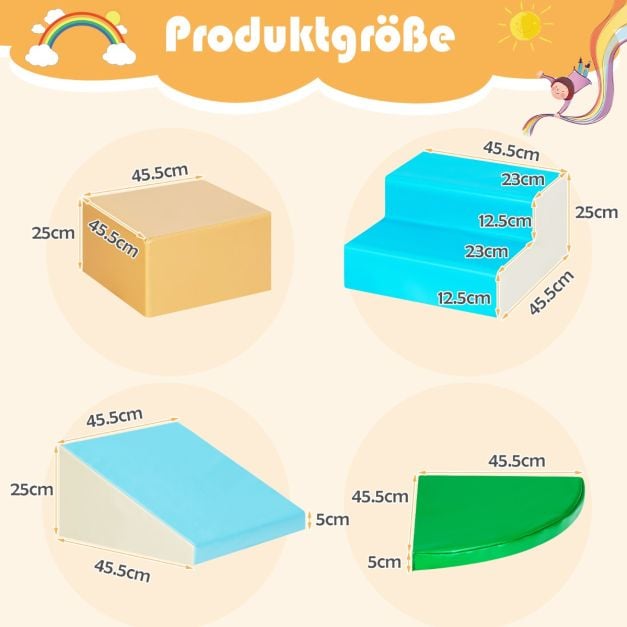 Made of high-quality EPE foam, this activity play set is safe and soft for babies to play. Plus, soft climber can protect your baby's knees and elbows from injuries. Parents can rest assured that your kids will play it safely. In addition, lightweight design makes it easy for babies to rearrange and build different configurations. And the dirt-resistant surface simplifies cleaning and maintenance steps, helping you save a lot of time and energy. If you are looking for 4-piece educational play set like this, do not hesitate to palce an order! Improve gross motor skills such as climbing, crawling and sliding Improve hand-eye coordination and gain confidence EPE foam protects your little one's knees and elbows form injuries Lightweight for free arrangement and easy transport Waterproof PU material makes it easy to clean and maintain PU leather surface has a strong tear resistance and wear resistance Good workmanship and exquisite sewing stitches prevent cracking Ideal for kindergartens, living rooms and bedrooms ASTM certification ensures high quality and long service life