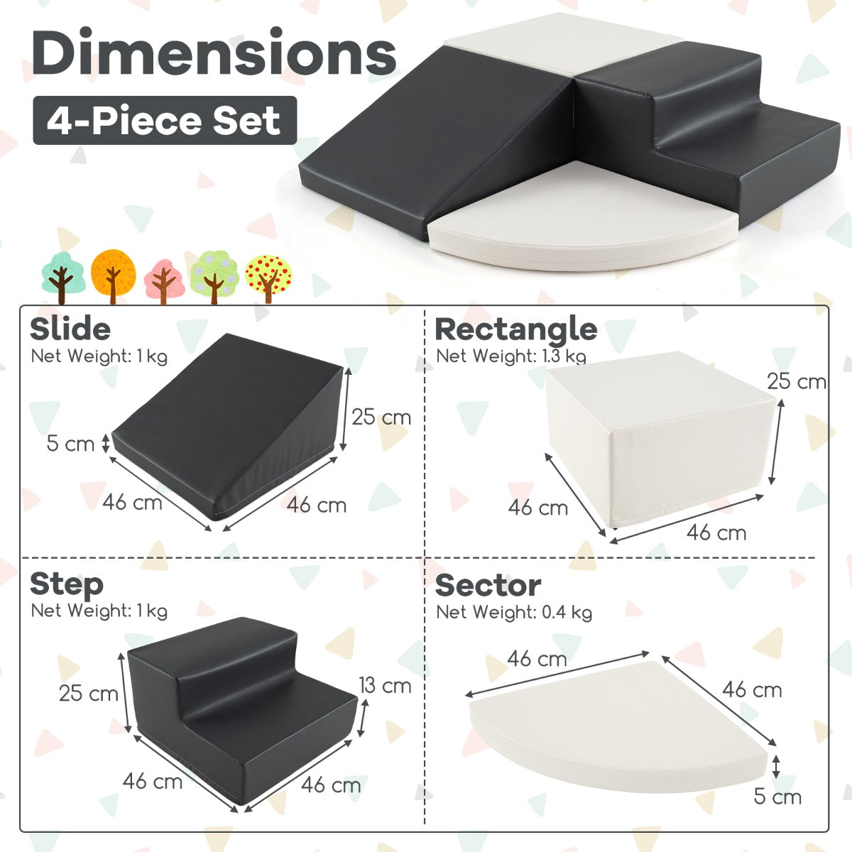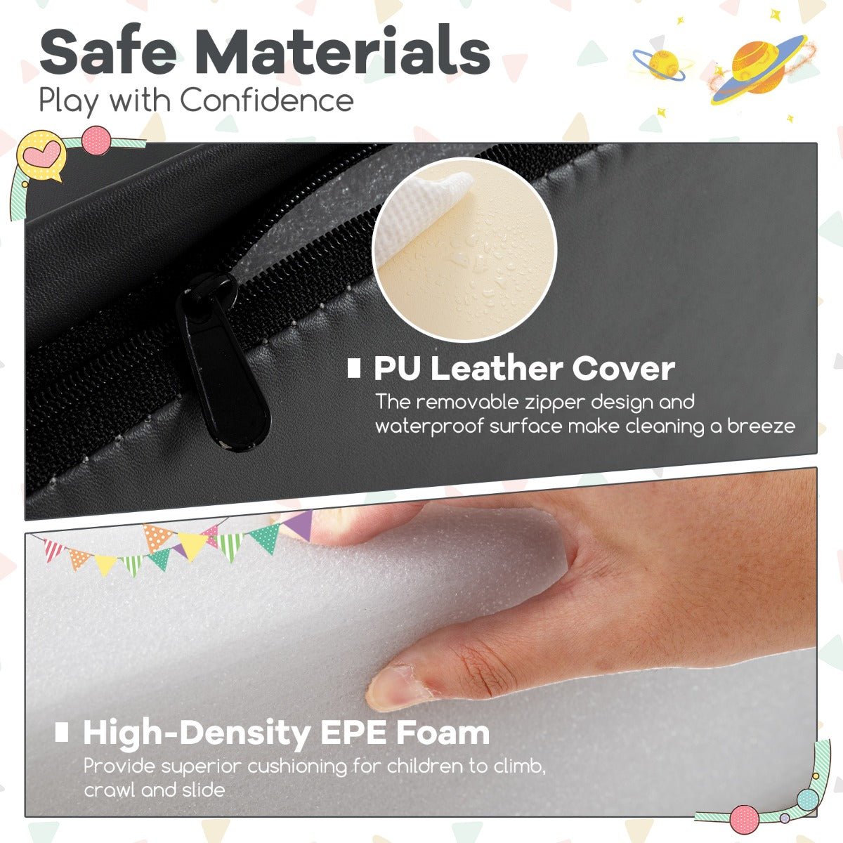 Made of high-quality EPE foam, this activity play set is safe and soft for babies to play. Plus, soft climber can protect your baby's knees and elbows from injuries. Parents can rest assured that your kids will play it safely. In addition, lightweight design makes it easy for babies to rearrange and build different configurations. And the dirt-resistant surface simplifies cleaning and maintenance steps, helping you save a lot of time and energy. If you are looking for 4-piece educational play set like this, do not hesitate to palce an order! Improve gross motor skills such as climbing, crawling and sliding Improve hand-eye coordination and gain confidence EPE foam protects your little one's knees and elbows form injuries Lightweight for free arrangement and easy transport Waterproof PU material makes it easy to clean and maintain PU leather surface has a strong tear resistance and wear resistance Good workmanship and exquisite sewing stitches prevent cracking Ideal for kindergartens, living rooms and bedrooms ASTM certification ensures high quality and long service life