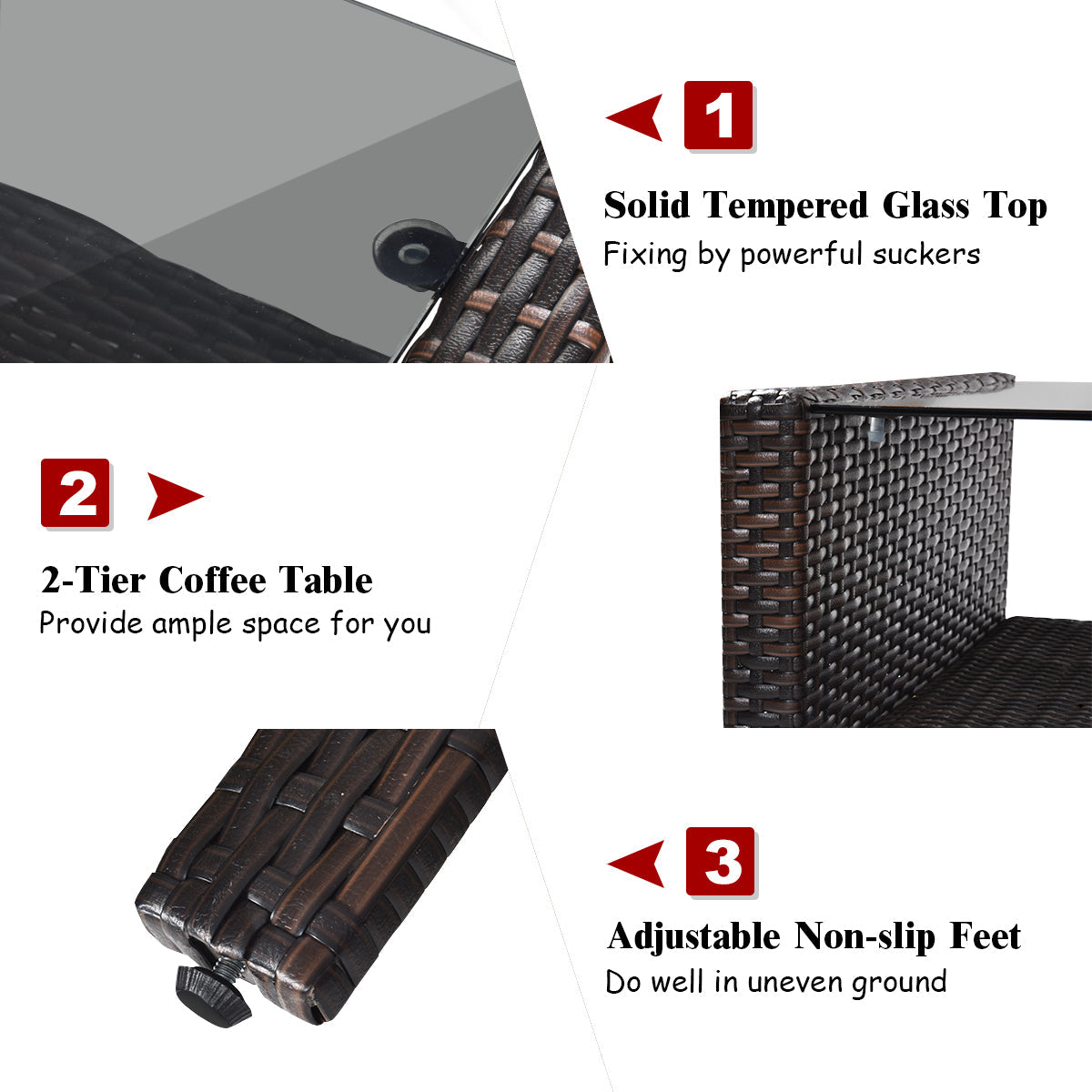 Enjoy a pleasant leisure time with your family or friends on this conversation set! Coming with 2 armchairs, 1 loveseat and 1 coffee table, this patio couch set provides 4 seats for you and your friends or family. With the high-resilient cushions, backrests and armrests, you guys can sit comfortably around the table in the open air to eat, drink and talk. Besides, the storage shelf also allows you to place various daily items. If you need to, you can freely change the combination of this furniture set in the way you like. As for cleaning, the seat cushion covers are fitted with zippers and easy to remove. And the tempered glass tabletop is smooth enough to be easily cleaned. In general, this furniture set made of all-weather PE material is a great addition to various outdoor occasions. Durable Material and Stable Structure: Made of PE rattan, this patio conversation set is weather-resistant and can be used outdoors for a long time. Moreover, the reinforced steel frame shows a strong bearing capacity. The adjustable foot pads help to easily stand on uneven ground and make it more stable. Table with Storage Space: The table of this patio furniture set features a large tempered glass tabletop and a storage shelf, so that you can store various items, such as food, fruit, magazines, etc. What's more, the tempered glass tabletop allows you to easily wipe off the stains with a soft cloth. Super Comfortable Seat: 2 single chairs and the loveseat are equipped with seat cushions and back cushions padded with soft sponge. And with wide backrests and ergonomic armrests, you can fully relax on the sofa. Besides, the zippered covers of the seat cushions are removable for easy cleaning. Note: Due to the light avoidance and light exposure, the color of the cushions is slightly different. Free Combination: The table, loveseat and 2 armchairs enable you to freely combine them according to your preferences or the space of different places. With a modern and simple design, this 4 PCS outdoor sofa set is an ideal addition to the backyard, poolside, garden and other outdoor places. Easy to Set up: This wicker sectional sofa set will be shipped in 2 packages that may arrive on different dates. By using the hardware and following the user manual with detailed steps, you can easily and quickly complete the assembly. Please do not tighten all the screws until all the holes are aligned to facilitate the installation