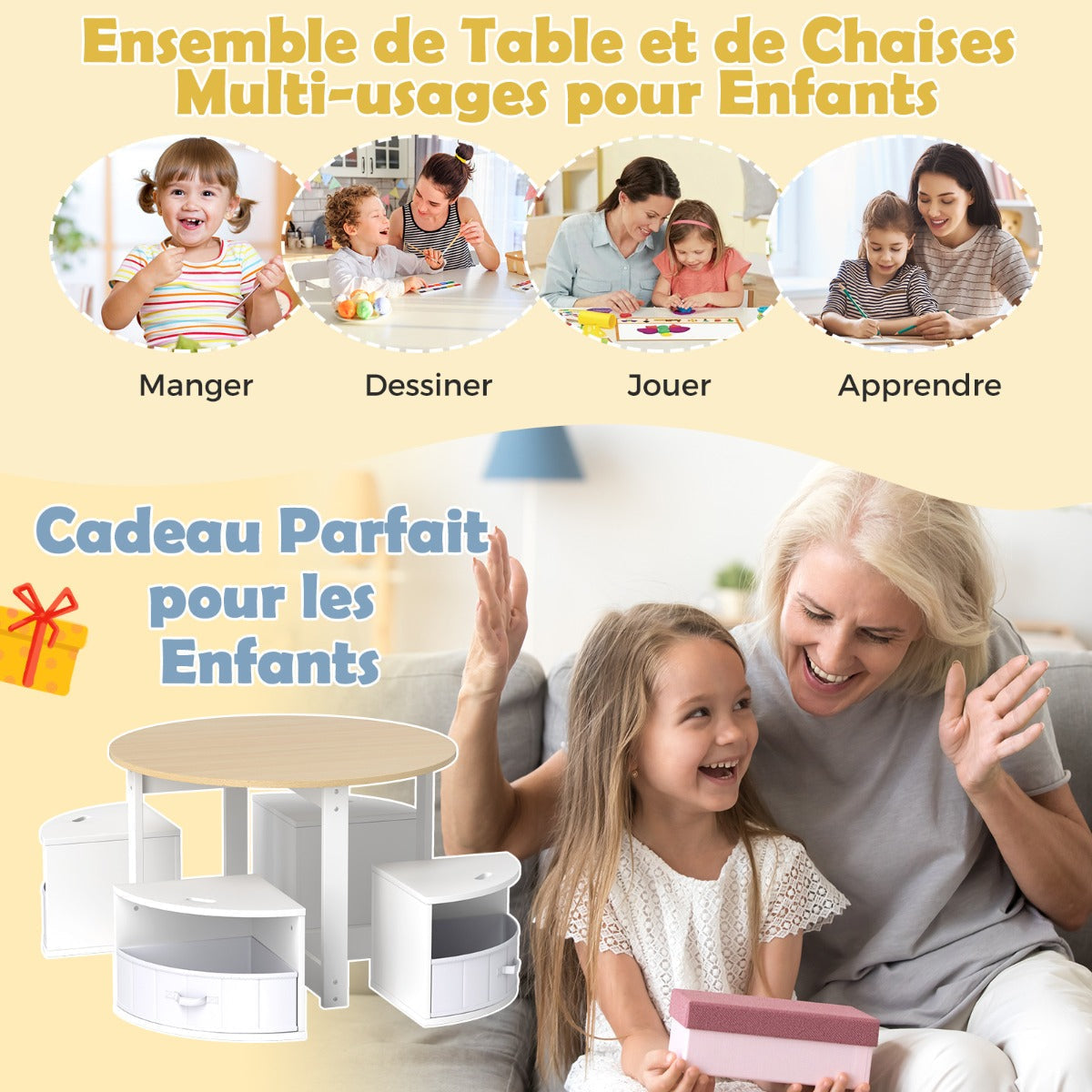 Perfect for various activities, the set includes 4 stools with storage bins for easy organization. Compliant with ASTM and CPSIA, the sturdy MDF structure ensures safety and durability. Featuring rounded edges, waterproof finish, and anti-scratch pads, this set offers both comfort and protection. With a sleek design suitable for any room, this nesting table and stool set is a stylish and practical addition to your home. Bullet Point:Versatile Nesting Design: This multi-use kids table and chair set includes 4 stools, ideal for activities such as eating, drawing, playing, or learning. Moreover, the stools can be stored under the table to save space when not in use. Built-in Storage Space: Each stool features a removable storage bin beneath the seat, offering convenient space to store toys, books, stationery, snacks, craft supplies, and more, keeping your child's play area tidy and organized effortlessly. Safety Comes First: This kids' table and stools set is fully compliant with ASTM and CPSIA, ensuring a safe and healthy environment for your children to learn and play. The sturdy MDF structure can withstand children's energetic play. Weight capacity: 50 kg (tabletop), 90 kg (stool). Thoughtful Details: Smooth and round edges protect against scratches and scuffs, and a waterproof finish brings an easy-to-clean surface. The stools are easy to move with integrated carry handles, and its anti-scratch foot pads avoid floor damage. Sleek and Simple Style: This round nesting table and stools set will complement any home decoration, making it a great addition to any living room, playroom, or bedroom. Table dimension: 79 cm x 79 cm x 51 cm (L x W x H). Stool dimension: 33 cm x 33 cm x 28.5 cm (L x W x H).