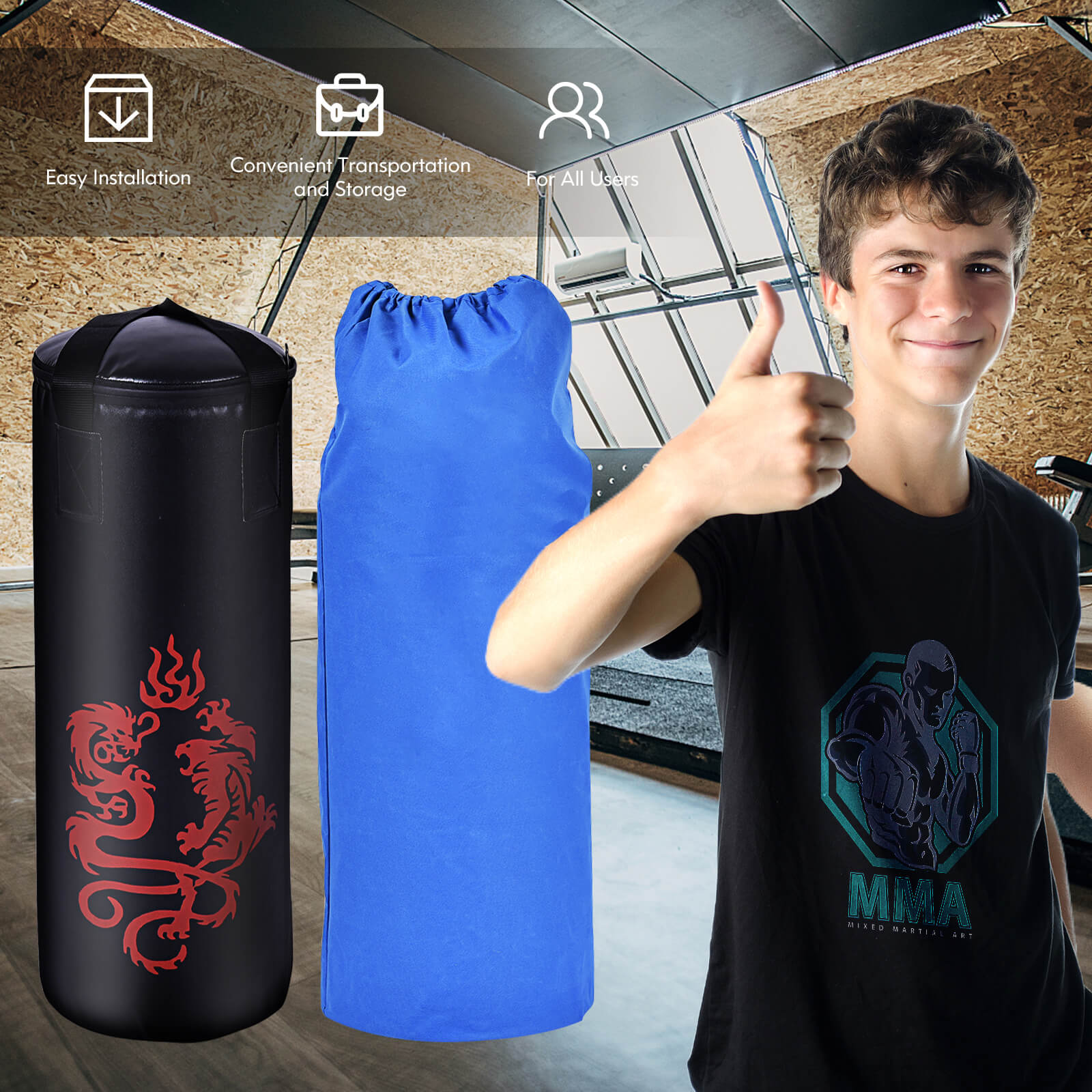 This boxing and punching bag set includes a filled punching bag, a pair of 0.3 kg boxing gloves, a skipping rope, a carrying bag and mounting brackets. The punching bag can be used in boxing, MMA, karate, Muay Thai, kickboxing and more sports. Made of PVC leather and foam, the boxing bag ensures durability for long-term use, preventing tearing up during use. The sponge-padded boxing gloves can effectively absorb shock and reduce pressure. This punching bag kit is easy to install and includes mounting hardware. It will be the perfect gift for kids that can help your child improve physical health, release energy, and boost confidence. If you are looking for such a product, do not hesitate to buy it! Multipurpose Kids Boxing Set: This hanging punching bag provides efficient training for young fighters, ideal for MMA, Karate, Taekwondo, Muay Thai, kickboxing and more. This punching bag set is a perfect gift for 6+ years old kids, helping them strengthen physical fitness, release stress, improve self-confidence, etc. Premium Materials: This surface is made of PVC leather, which is durable, tear-proof and wear-resistant. The multi-layer punching bag with foam padding provides a comfortable punching experience and ensures rapid rebound. More, the reinforced straps attached to the bag through tight stitching on the sides will increase the service life. Boxing Gloves and Skipping Rope: A pair of 0.3 kg boxing gloves filled with high-density sponge, provide the perfect protection and shock absorption for kids’ hands. In addition, the air vent holes promote air circulation for extra comfort. Plus, the hook and loop fastener ensures that the glove is firmly attached to the wrist. Pre-filled and Replaceable Stuffing: Compared to some kids punching bags, this punching bag came pre-filled with rags and sand. Besides, you can remove inside stuffing and refill to customize the weight(max stuffing weight 5 kg). The punching bag works with cloth, sand or other stuffing, and zippered top design allow for easy access. Quick Installation and Easy Storage: With complete and reinforced mounting accessories, this punching bag kit can be stably hanged to many places, such as ceiling, wall bracket and sandbag rack. Besides, the smooth waterproof surface is easy to clean and maintain. And the punching set can be stored in a carrying bag when not in use.