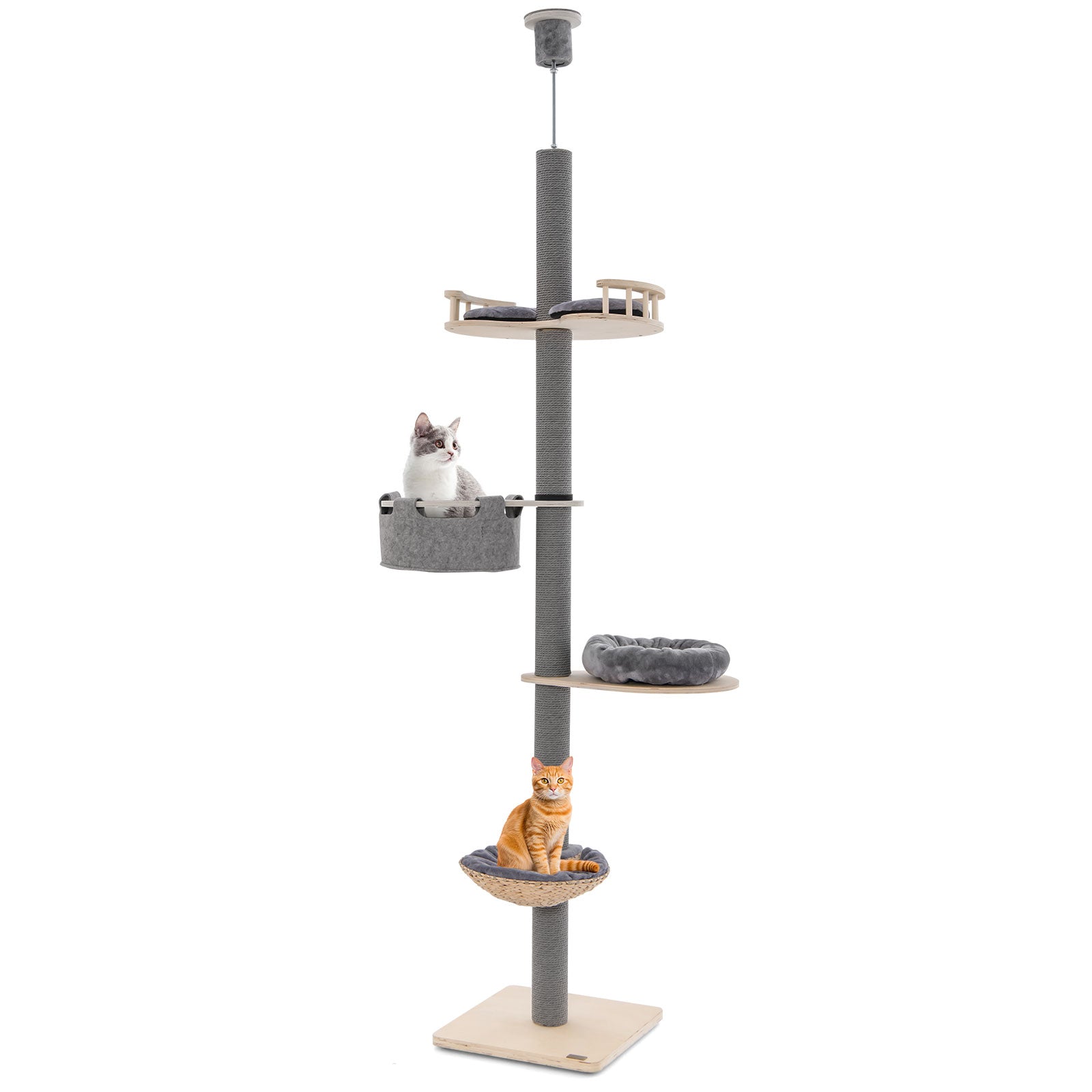 Create a Cozy and Versatile Activity Space for Your Lovely Furry Friends! The floor-to-ceiling cat tree measures 48 x 48 x 236-271 cm (L x W x H) and comes with 5 tiers, providing spacious activity spaces for cats to explore, scratch, play, and relax. The height can be adjusted from 236-271 cm to fit different ceiling heights. And thanks to its compact size, this cat tree occupies minimal floor space while providing maximum vertical space. Built with durability in mind, our cat tower adopts a plywood frame and a thickened supporting post, ensuring a solid foundation for your cat to explore and play on. More than that, this multifunctional cat tree includes a fence springboard for interactive play, a comfy hammock for lounging, a round basket bed for cozy naps, and a soft cat bed for ultimate relaxation, providing various relaxation options. And the long vertical scratching post provides a satisfying scratching surface that helps keep your cats' claws healthy. Additionally, there are 3 soft plush cushions, providing lasting comfort and support for your beloved pets. This floor-to-ceiling cat tower would make your kitten’s day full of excitement! Space-Saving Design and Adjustable Height: This floor-to-ceiling cat tree features a 48 x 48 cm (L x W) compact base, which takes up minimal floor space while providing maximum vertical space for your cats to explore. Besides, with an adjustable metal fixing rod, it can fit ceilings ranging from 236-271 cm in height, allowing for easy installation without the need for drilling. Stable and Reliable Construction: The 5-tier cat tower is constructed of a solid plywood frame and supported by a large wood base, providing a safe activity center for your lovely furry friends. Moreover, it adopts 10 cm robust supporting posts, ensuring maximum stability. Multiple Resting Spots: The cat climbing furniture comes with a soft cat bed, round basket bed, and a comfy hammock, thus your furry friends will have plenty of options to lounge, relax, and take comfortable naps throughout the day. Moreover, there exists a fence springboard for overlooking and resting. Comfortable and Durable Materials: The cat tower features 3 ultra-soft and pet-friendly plush cushions, bringing warmth and ultimate comfort to your lovely cats. Besides, the hammock is crafted of non-woven fabric, which is scratch-resistant and skin-friendly. And the basket bed is crafted of hand-woven natural cattail fluff, providing a breathable and comfortable lying experience. Scratching Posts and Easy Maintenance: The floor-to-ceiling cat tree comes with a scratching post that extends to the ceiling, allowing your cats to engage in vertical scratching. Other than that, it features 3 detachable cushions, bringing convenience for cleaning, which could keep a clean and hygienic environment for your furry friends. Note: For maximum stability, please push down the main body of the cat tree with force, rotate the pole until it reaches the maximum length that your ceiling can support, and lock it in place.