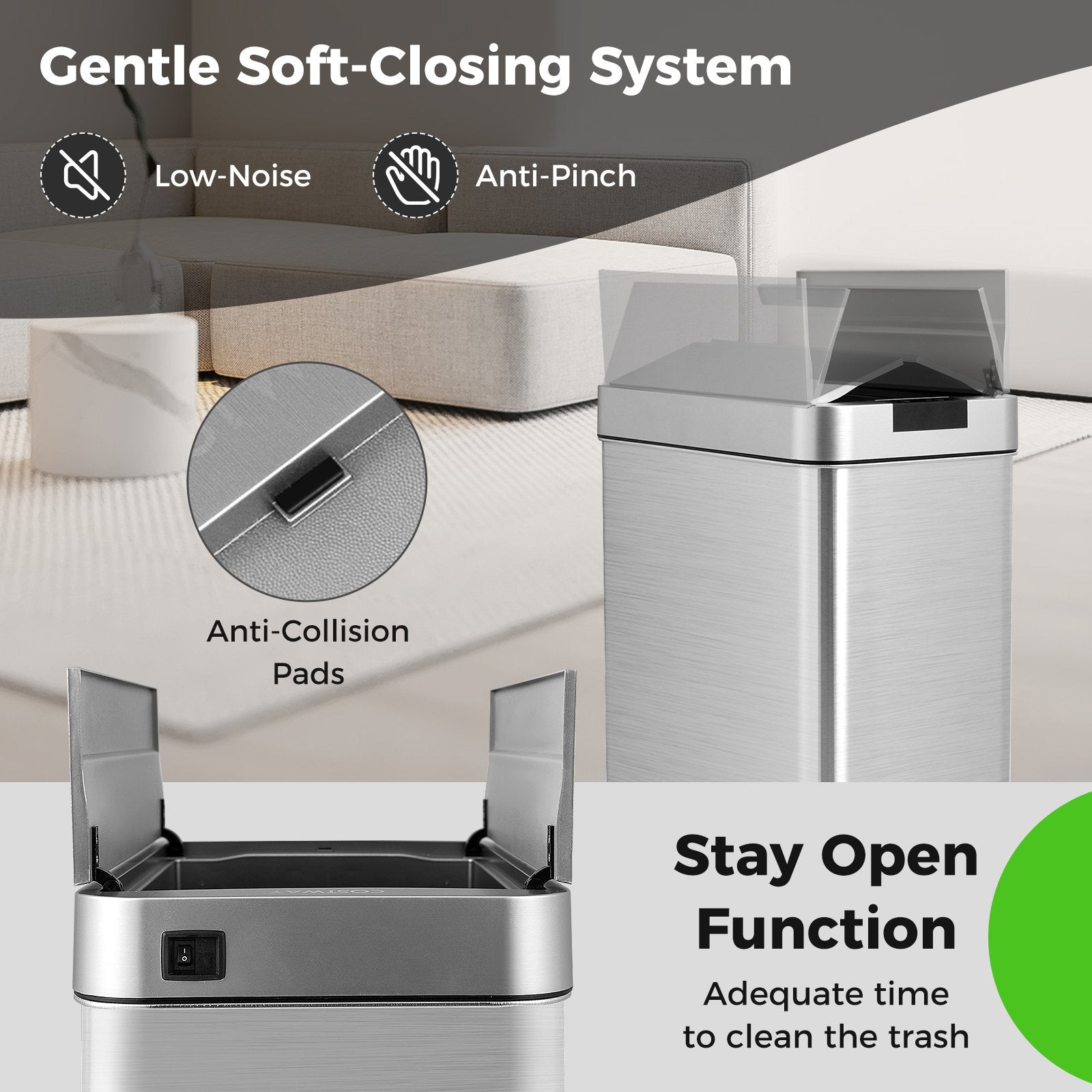Effortlessly open the automatic waste bin with an infrared motion sensor by simply waving your hand. This device offers a 0.05s quick response and 6s automatic closing, ensuring a touch-free experience. Made of robust and stain-proof stainless steel, this trash can promises great longevity, while offering a 50L capacity. The soft-closing wing lids ensure low-noise and anti-pinch features. As needed, the lids can remain open at an angle of 87°. The slim shape and wing lids allow for easy placement in compact areas or under a low countertop. This motion sensor trash bin is effortless to use and needs 4 x AA batteries (not included), upgrading your waste disposal experience with its sleek and convenient design. Infrared Motion Sensor: A simple wave of your hand, just 15cm away, prompts the lids to open automatically in just 0.05s, offering a touchless operation. After 6s, the lids of trash bin automatically close. This hand-free mechanism is powered by 4 x AA batteries (not included) and includes a manual control option. Stainless Steel Structure: The robust inner stainless steel layer promises durability and sturdiness for the trash can, while the middle drawing wire layer adds a modern texture. In addition, the outer anti-fingerprint layer resists smudges and stains, maintaining a pristine appearance even with frequent use. With Generous Capacity: Tackle more with less effort using the 50L trash can. Perfect for busy kitchens or offices, it comfortably accommodates everyday waste, minimizing the hassle of frequent disposal. By the way, it is optimally designed to fit trash bags sized 70 x 90cm or larger. Stay Open and Soft Close: The automatic waste bin enables you to master multitasking during meal prep thanks to the stay-open design, which allows the lid to remain open at an 87° angle for as long as necessary. Beyond that, the soft closing feature ensures the lids close smoothly, reducing noises and potential damage from slamming. Wing Lids and Slim Shape: Optimized for compact spaces, the motion sensor trash can boasts a slim shape that slides neatly into tight spots or against narrow walls. The innovative wing lids are specially designed to fit comfortably under a low countertop, providing easy access without the need for overhead clearance.