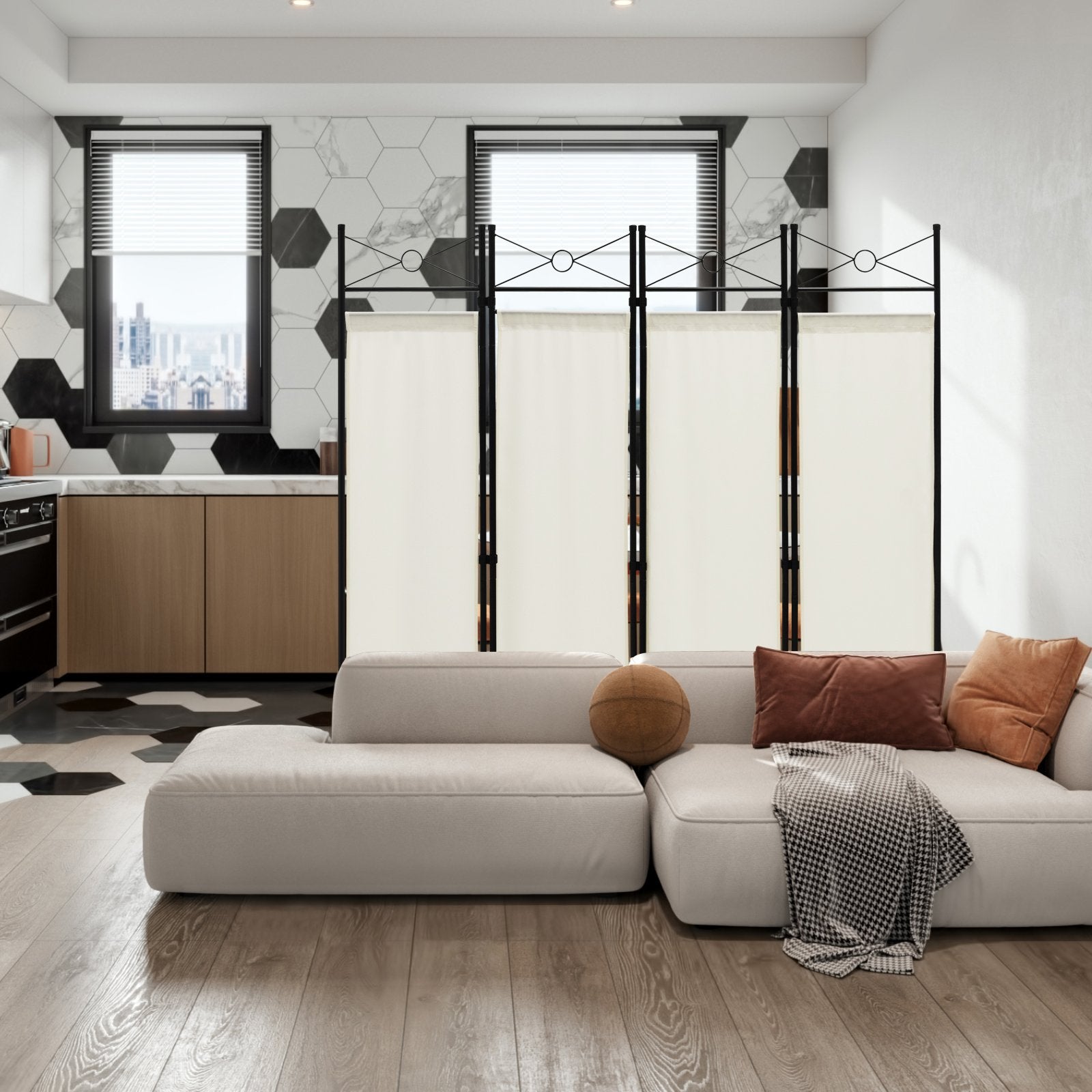 This folding room divider features hard and powder-coated steel structure to ensure high-level stability and durability. The powder-coated surface is effective to prevent against rust. And non-slip mats protect the floor from scratches. Moreover, breathable polyester material is wrinkle-resistant and can withstand repeated cleaning. Exquisite design makes this folding room divider simple but not monotonous. This folding room divider can separate different areas of your home and improve the quality of your life. Foldable design makes it convenient store and carry. This folding room divider applies to a wide range of scenarios such as living room and bedroom. Designed for Privacy: With non-see-through design, this 4-panel divider will perfectly create a private space for you to relax, work or entertain. It will be a great addition to your living room, bedroom, study and office. Therefore, you can do anything you want in your own space at ease. High-Grade Polyester Cloth: The polyester cloth on the four panels resists well to ripping and tearing, ensuring long-lasting service life. And it can be easily detached with the hook and loop fasteners. Furthermore, the polyester fabric is simple to maintain, which saves much of your effort. Folding Design and Light Weight: Each panel is firmly connected with each other with a 180° rotatable activity link. Thus, you can quickly fold the room divider when not in use. The compact folding size makes the storage much more space-saving. What's more, the room divider weighs only 13 lbs, which is effortless to carry. Heavy-Duty Steel Frame: This folding room divider is made of premium steel, which is strong and durable with good stability. The powder-coated surface can effectively prevent rust and prolong the use of this divider. Also, non-slip footpads are effective to reduce scratches on the ground for better protection. Simple Assembly: Coming with complete accessories and a clear instruction, the divider is simple to put together. You just need to connect the steel pipes, install the activity links and then install the polyester cloths. Dimension of fully-expanded divider: 157.5 x 181.5 cm (L x H). Dimension of folding divider: 39 x 8.5 x 181.5 cm (L x W x H).