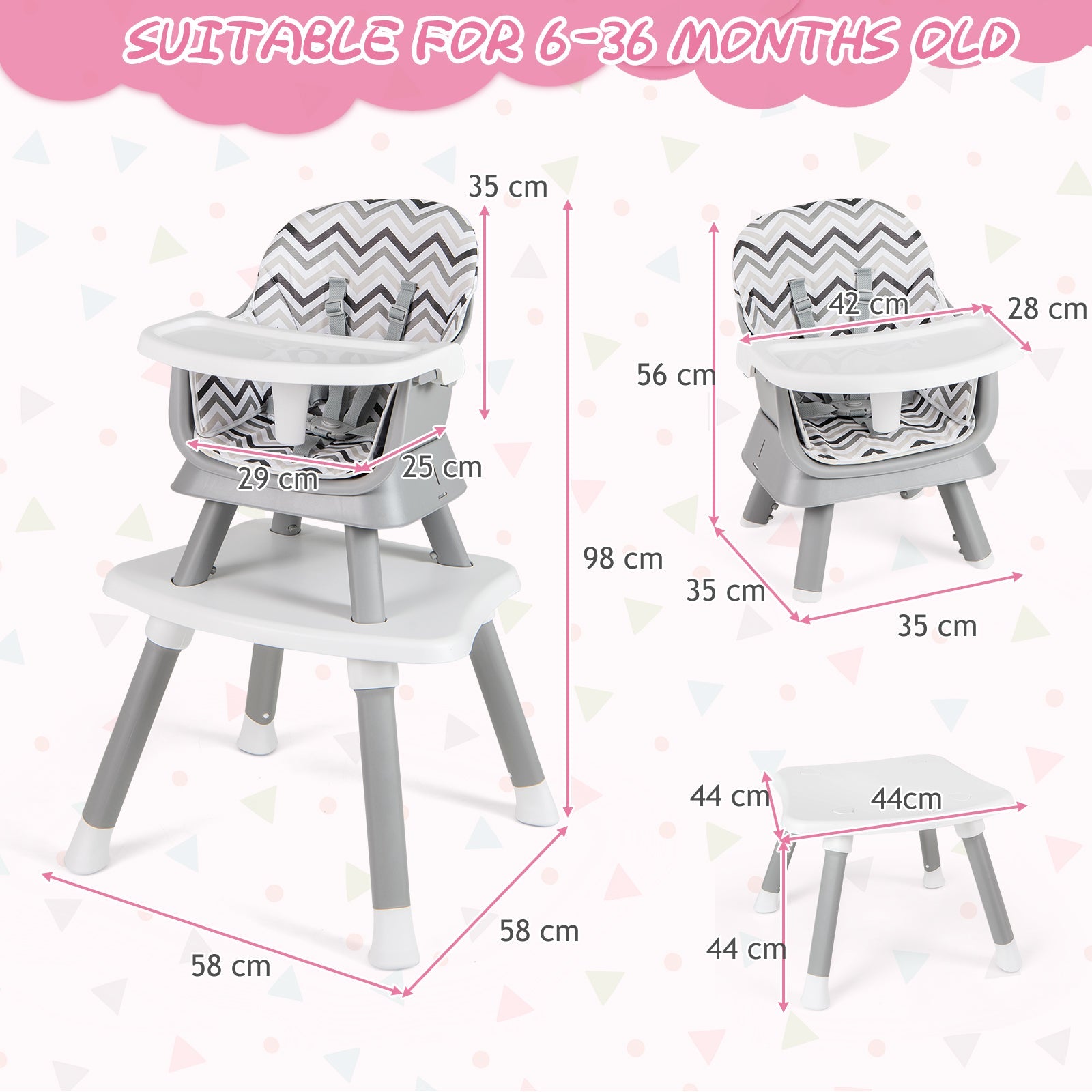 Colour: Pink/Grey/Yellow Material: PP, PU leather Overall dimension: 58 x 58 x 98 cm (L x W x H) Size of low chair: 35 x 35 x 56 cm (L x W x H) Size of table: 57 x 44 x 44 cm (L x W x H) Size of tray: 42 x 28 cm (L x W) Net weight: 7.5 kg Weight capacity: 25 kg Suitable age: 6-36 Months Box Qty:1(May vary by batch)Package includesÔºö 1 X Baby high chair 1 X Instruction Manual