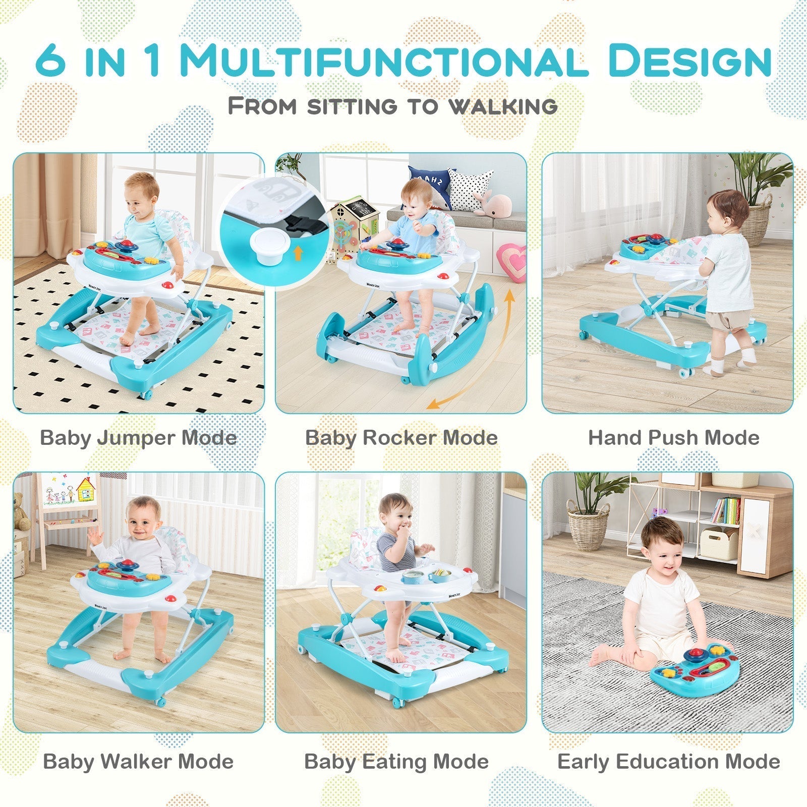 -Can be used for walking, eating, jumping, learning, rocking and more-Adjustable in 3 height options, perfect for growing kids-Equipped with a music tray to provide interactive fun while walking-Comes with 6 removable and soft foot pads to offer extra support-Avoids hand pinching with ample safety distance-Ensures a healthy sitting posture with an ergonomic backrest-Smooth and stable rolling with universal fronts wheels and stopper wheels -Space-saving for storage with a foldable design-Includes a removable and machine washable seat cushion-Made of kid-friendly materials, ASTM and CPSIA certified