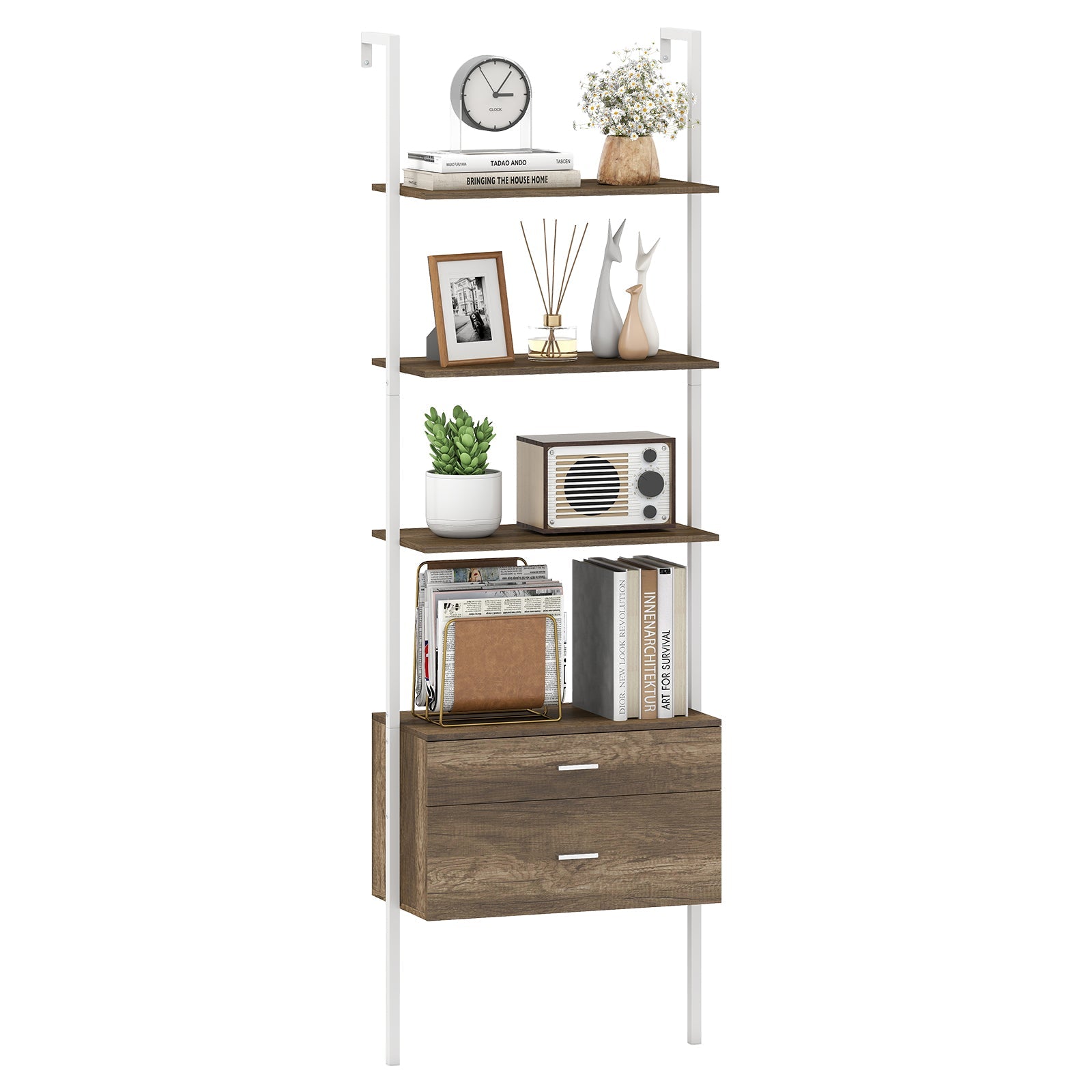 Fully utilize your living space with this ladder bookshelf! This bookshelf with drawers is a practical storage solution that combines open display shelves with the practicality of concealed storage. To ensure a sturdy structure, the tall bookcase is reinforced with heavy-duty metal frame and a double anti-tipping design to keep it securely in place. Elevate the look of any room with this wall-mounted bookshelf, designed to offer both functionality and a touch of modern elegance. Adequate Storage & Display Space: The ladder bookcase features 4 open shelves to showcase books, ornaments, or collectibles. Additionally, 2 deep drawers provide concealed storage for items, reducing clutter and keeping your space tidy. Safe Wall Mounting: The double anti-tipping design provides a secure way to prevent bookshelf from wobbling. The strong anchor points ensure secure attachment to the wall, offering a reliable and stable structure. Built to Last: This wall-mounted bookshelf is constructed with a powder-coated metal frame that boasts great sturdiness and stability. Together with thickened board, the ladder shelf is a reliable addition to your home. Timeless Modern Charm: This versatile piece functions as a bookcase, display shelf, or storage organizer in your living room, study, or office. Its sleek lines and contemporary design add an appealing touch to your home. User-friendly Design: With metal slide rails and handy handles, this tall bookcase allows smooth and quiet opening and closing of drawers. The 28 cm raised support legs provide ample room for floor cleaning.