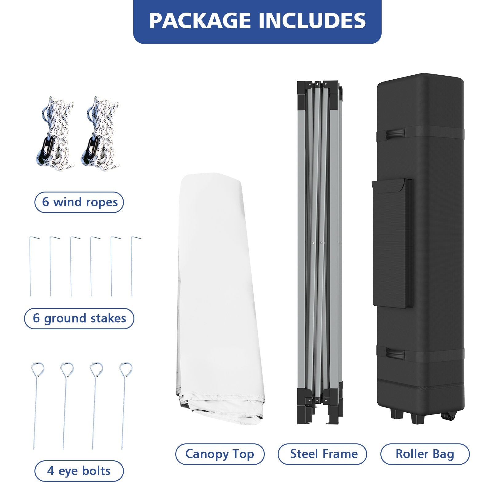 Perfect outdoor shelter canopy! Are you looking for an garden gazebo that is easy to carry and store outdoors? This folding tent offers 3m x 6m of shade and is ideal for outdoor picnics, parties, or business events. The party tent is made of 300D silver-coated oxford fabric, which provides sun protection and water resistance. And the powder coated steel frame is strong and resistant to rust. In addition, we provide ropes and stakes to fix the canopy to the ground for improved stability. In addition, this functional tent comes with a portable wheeled storage bag, making the camping gazebo easier for you to take the waterproof gazebo to the beach, markets, parks and other places. 3 Height Positions and Sturdy Frame: The pop up canopy has easy-to-operate height adjustment buttons on each legs. The gazebo height can be adjusted to 310cm, 320cm and 330cm according to different needs. The canopy is composed of powder-coated steel frame, which is stable and rust resistance. Weather-resistant Material: The pop up gazebo adopts high-quality silver coated 300D oxford cloth, which is tear resistant and can effectively block the hot sun. Thus,this folding canopy tent can provide reliable shelter for you sunny days. Large Shelter for Multiple Activities: This folding canopy has provided 3m x 6m spacious space, which can accommodate about 20 people. You can place dining tables, lounge chairs to hold various outdoor activities, such as party, picnic, wedding. It is ideal for beach, park, yard, etc. Portable Wheeled Storage Bag: The 300D black PE coated wheeled storage bag is easy to carry, move and stand on. The bag measures 165 x 40 x 24cm, which is compact enough to fit in most car trunks. You can take marquee canopy to the beach, park or wherever you want easily! Besides, the carrying bag has a small pockets to store windproof rope and nails. Easy Set up Folding Design: Equipped with a clear instruction, this instant canopy tent can be easily set up in a short time without additional tools. All you need to do is unfold the steel frame, secure the canopy cover with hooks and buckles, adjust outdoor gazebo to the right height, and install the windproof rope and ground nails.