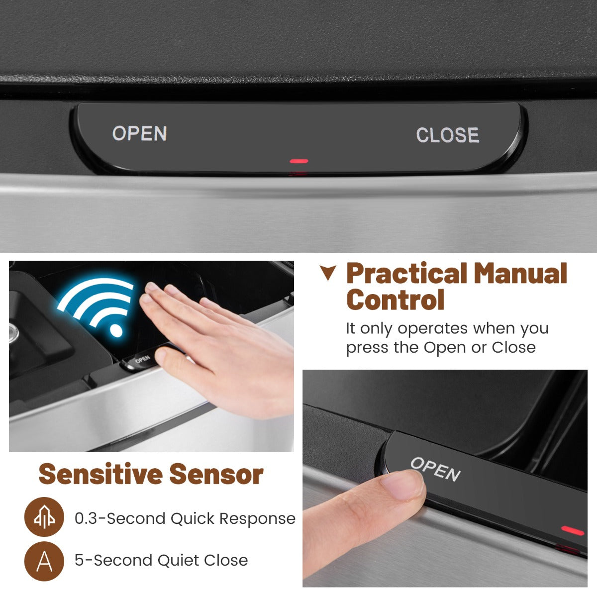 Introducing the innovative touchless motion sensor waste bin, designed to simplify waste disposal in style and convenience. This cutting-edge 72Ltrash can opens automatically in a swift 0.3 seconds upon detecting motion, offering a hands-free experience. It boasts a 46.5Lupper compartment and a detachable 3.5Lkitchen waste bin for efficient waste management. The thoughtfully crafted dual pull-out system provides 2small removable trash cans of 11L, allowing for seamless recycling. Experience ultimate ease with the stay-open lid feature and gentle soft-closing mechanism, ensuring quiet and hassle-free operation. Crafted from a durable 3-layered stainless steel construction, this trash canresists fingerprints and offers exceptional longevity. Complete with anti-slip foot pads, this trash binensures floor protection. Sensitive Motion Sensor: Easily discard waste without touching the trash can, thanks to the advanced motion-sensing technology that opens the lid automatically within 0.3s of sensing your hand. By the way, it needs 6 x AA batteries (not included). Extra Kitchen Waste Bin: The trash bin contains a 46.5L upper compartment and a 3.5L removable kitchen waste bin that enables you to effectively tackle kitchen waste. Therefore, it becomes a smart integration to keep your kitchen clean. Dual Pull-Out Trash Cans: Sort and manage your recyclables with ease using the 2 small removable trash cans of 11L, cleverly designed for seamless recycling. Plus, the waste bin has 2 smooth wheels, ensuring a pull-out design for flexible use. Stay-Open andSoft Closing Lid: When you are in the midst of food prep or cleanup, the trash can’s stay-open lid feature is your silent assistant, which has a max opening angle of 88°. Additionally, it offers a soft-closing design that eliminates the banging. 3-Layered Stainless Steel: Simple maintenance is ensured by the 3-layered stainless steel structure that presents great fingerprint resistance and exceptional durability. In addition, the waste bin comes with anti-slip foot pads, keeping the floor away from scratches.