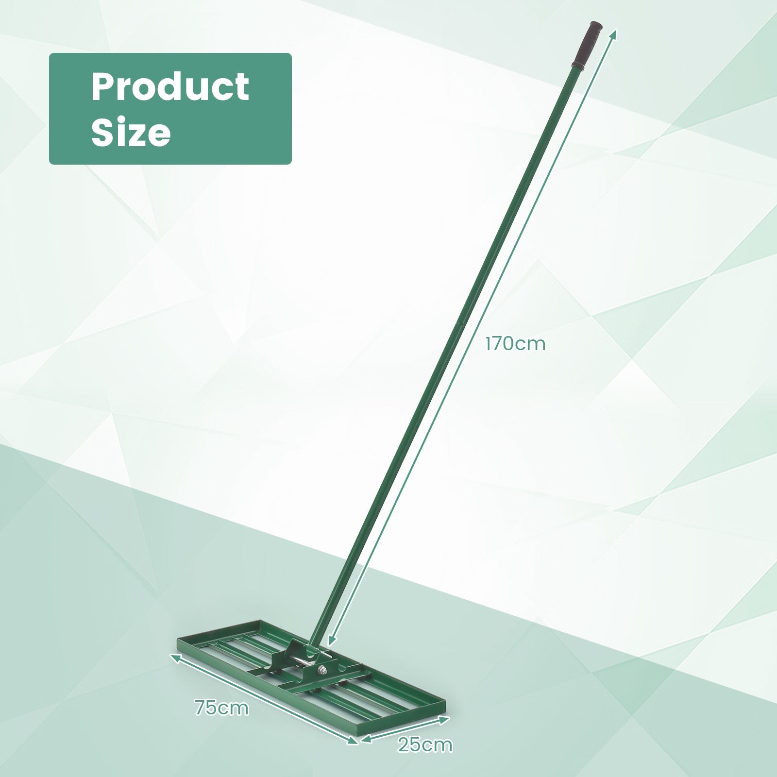 Colour: Green Material: Metal, PVC Plate Dimension: 75/91/106 x 25 cm (L x W) Handle Length: 170 cm Net Weight: 5/5.5/6 kg Box Qty:1(May vary by batch)Package includes: 1 x Lawn Leveling Rake 1 x Instruction Manual
