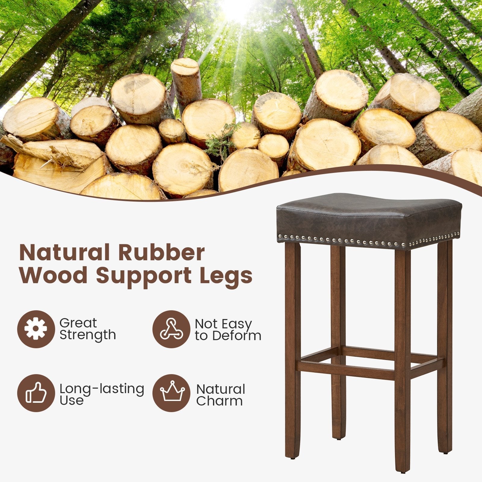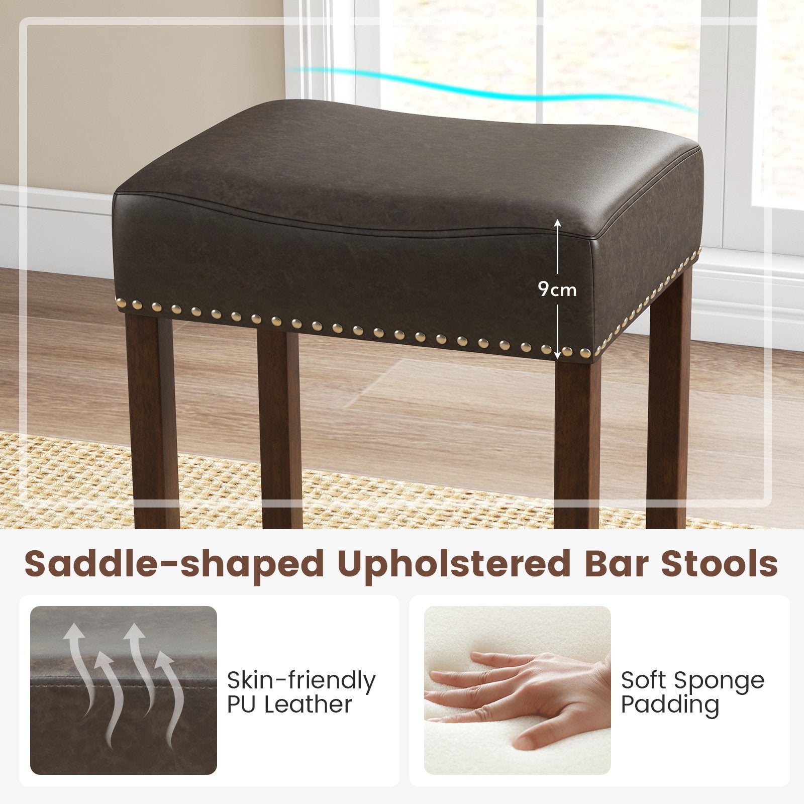 Designed with a saddle-shaped seat for ultimate relaxation and improved posture, you'll feel like luxurious comfort as you sit back and relax. Crafted with skin-friendly PU leather and a high-density sponge, every seating experience is a plush one. The pub stools are built to last with solid rubber wood legs that can handle a considerable weight, while non-slip foot pads ensure stability, perfect for those endless hours spent chatting with friends. With rivet accents adding a touch of sophistication, these kitchen stools offer a versatile and elegant design. Plus, enjoy enhanced comfort with the sturdy footrest. Say goodbye to hassle as this easy-to-clean PU leather seat guarantees a fuss-free maintenance routine. Get ready to transform your space with style and comfort now! If you are looking for such a product, do not hesitate to buy it! Ergonomic Saddle-shaped Seat: The saddle seat design of these pub stools provides optimal support and promotes proper posture. With skin-friendly PU leather and a high-density sponge, it offers a plush and comfortable seating experience. Solid Rubber Wood Legs: Featuring solid wood legs, these saddle seat bar stools boast long-lasting durability and large weight capacity. Furthermore, the legs are fitted with non-slip foot pads for enhanced stability, making it ideal for extended use. Versatile and Elegant Addition: The rivet accents not only help secure the upholstery but also bring a sense of sophistication. Along with a sleek and elegant design, the kitchen stools add a touch of elegance to the space. Pleasant Detail Design: The kitchen island stools are equipped with sturdy footrest, allowing you to relax and enjoy your meals or drinks in utmost comfort. More details, like the proper seat height, bring the convenience to match most counters. Easy Assembly and Maintenance: With clear instructions and all necessary hardware included, assembly is a breeze. Additionally, the PU leather seat is easy to clean and maintain, ensuring hassle-free upkeep for years to come.