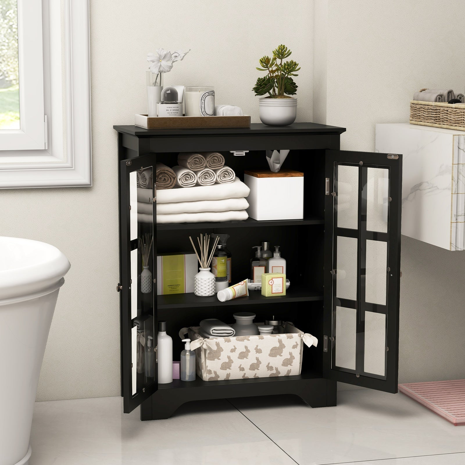 Bathroom Floor Cabinet with 2 Glass Doors and Adjustable Shelves-Black