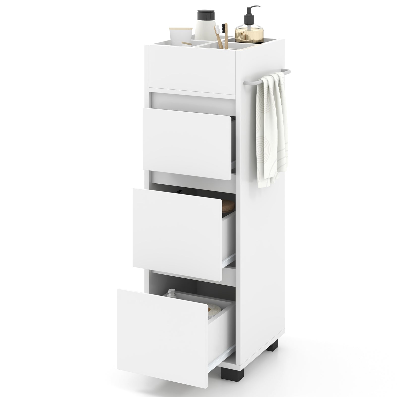Bathroom Floor Cabinet with 3 Drawers, 4 Top Dividers and 1 Towel Rack-White