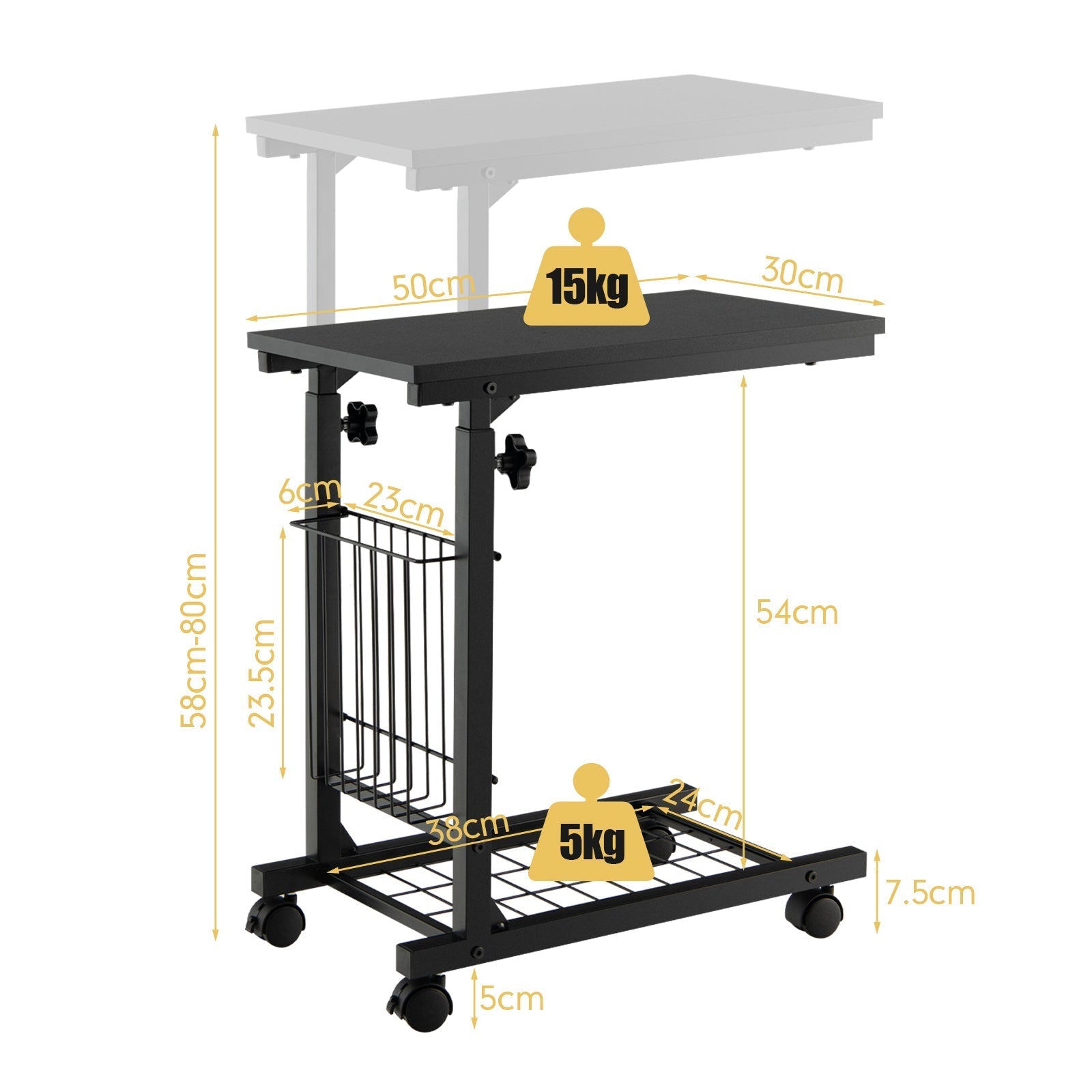 A good assistant for your working, studying or any other activities! Unique c-shape design is easy to insert the table into the bottom of the sofa or bed. The tabletop is spacious enough to put necessary office supplies. The combination of storage basket and bottom mesh storage shelf gives your more space to store daily items. Moreover, you can simply turn the knob to adjust your desired height. For great mobility and convenient use, the flexible casters make moving the sofa side table easier from one place to another. Whether used in the living room, bedroom and office, this c-shape end table will undoubtedly be an ideal choice. User-friendly C-shape Design: For the purpose of saving more space and flexible usage, the c-shape side table is smartly made to be placed in any small space and works equally well near the bed or sofa. You can tuck the table into the bottom of the sofa or bed to keep everything you need within arm's reach. Flexible Height Adjustment: This c-shape end table features an ergonomic height adjustable design, providing you with a new working environment to achieve optimal comfort. Through adjustable knobs, the couch table can be easily adjusted from 58cm to 80cm based on individual requirements. Reasonable Division of Storage Space: Durable tabletop facilitates the placement of a variety of daily items, such as cups, books and laptop, etc. In addition, the storage basket and bottom mesh storage shelf enlarge storage space for daily items and free up more table space, helping you keep a neat living space. Stable Structure and Easy Movement: In addition to the thick MDF, this laptop table is made of power-coated steel frame that features great sturdiness and long-lasting performance. It is equipped with 4 casters for flexible movement which can realize 360-degree swivel without noise. Two wheels with brakes are designed for higher stability. Rustic/Modern Style for Versatile Use: Vintage wood surface and black metal frame integrate (/Simple and modern design integrates) perfectly with interior decorations and add refined sensation to your home. Additionally, this side table is an ideal choice for living room, bedroom and office, whether used as a overbed table, laptop table, couch table and snack table, etc.