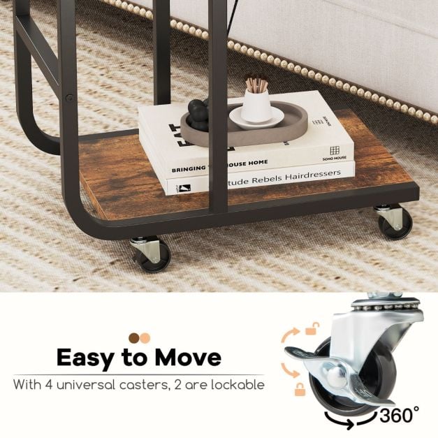 Slide this sleek, space-saving marvel under any sofa or bed, instantly enhancing your room with its clever 3-tier storage. Effortlessly glide it around on its smooth universal casters and lock it in place for ultimate stability. Built to last with a robust metal frame, this piece is as safe as it is stylish, showcasing stunning rounded corners and a reinforced crossbar. Plus, its rustic wood grain finish adds an elegant touch that complements any decoration style, while the waterproof surface ensures easy cleaning. Don’t miss out on this perfect blend of form and function - your next home upgrade is just a click away! Space-saving C-Shape Design: This end table is designed with a C-shape that features a 7.5 cm low profile base. It can fit snugly against a sofa or bed, maximizing space efficiency in your living room, bedroom, or office. 3-Tier Storage System: The sofa side table offers versatile storage with a multipurpose tabletop for everyday items. There is also a middle shelf for additional organization, and a bottom shelf for extra storage, making it a practical choice for any room. Universal Casters with Lockable Options: Equipped with 4 universal casters, the couch table provides easy mobility when needed. Additionally, with 2 locked wheels, it can also stay put for added stability and safety. Robust Metal Frame with Safety Features: The TV tray table boasts a heavy-duty metal frame for strength and durability. The sturdy construction is complemented by sleek rounded corners to prevent injuries and a reinforced crossbar for added stability. Rustic Aesthetics: The C-shaped table features a warm wood grain finish that goes well with its black frame, bringing a touch of rustic elegance to your living space. Meanwhile, the sleek surface is also waterproof for easy maintenance.