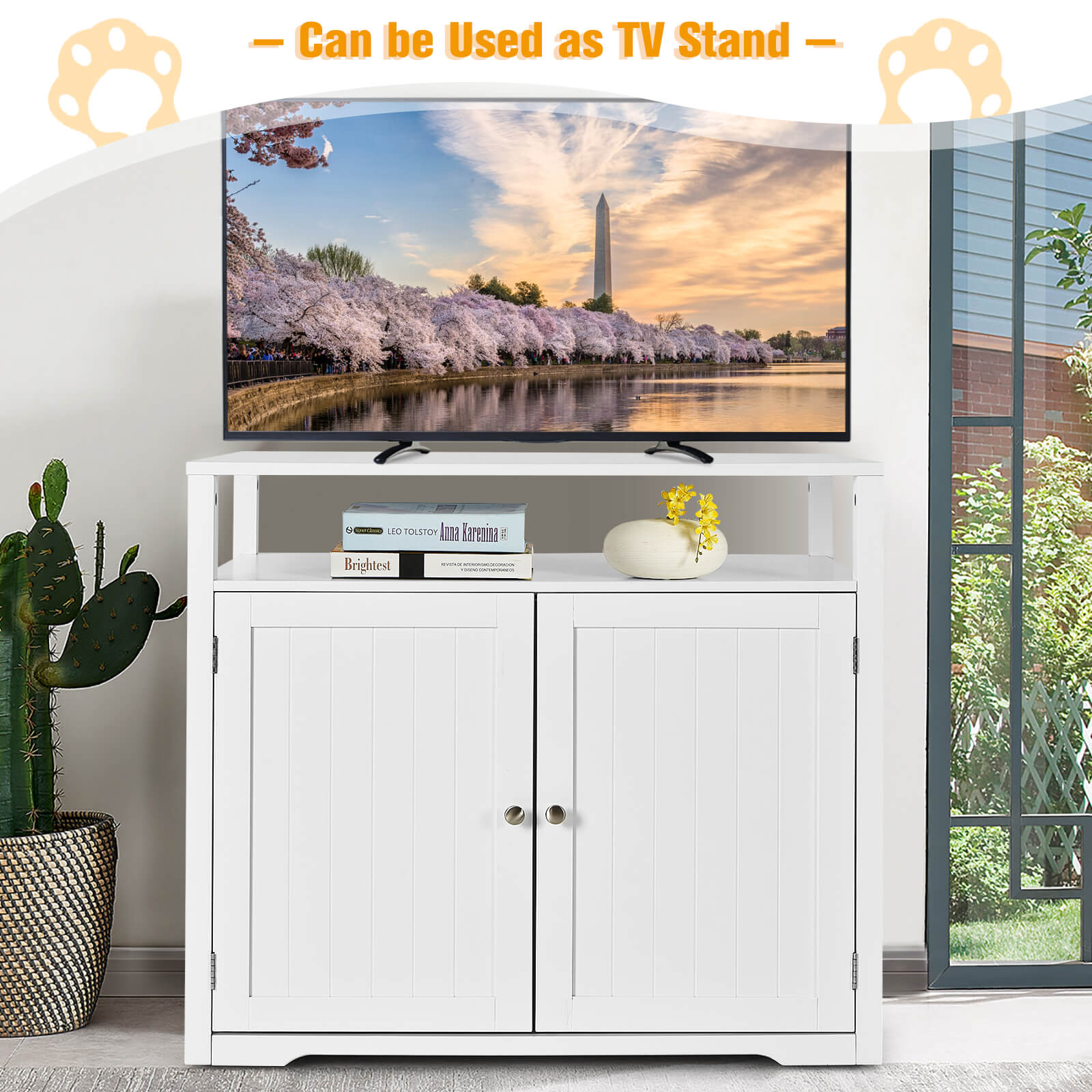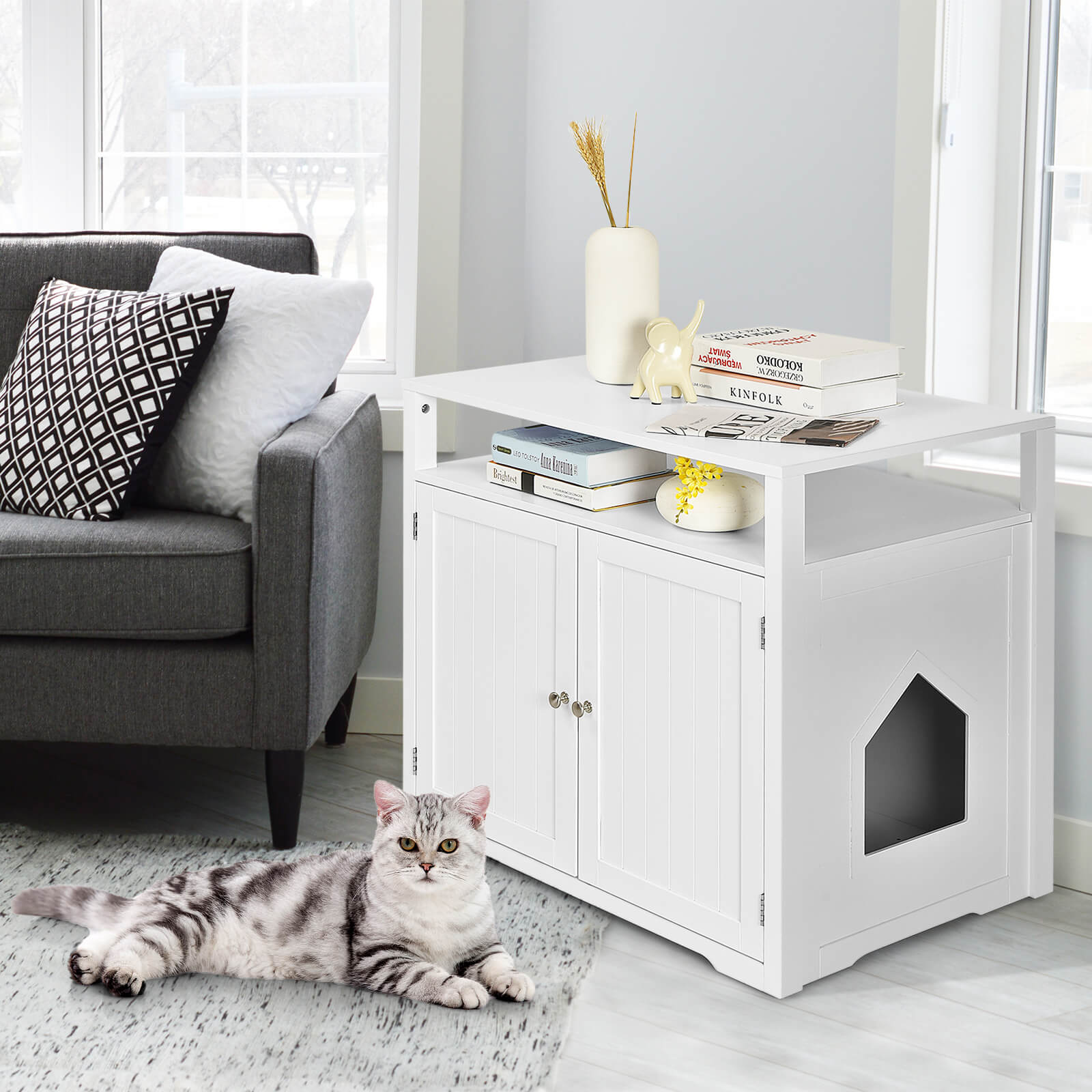 This litter box cover with a hole on the side gives privacy for your kitty for potty time and makes he/she easy to get in and out. Considering the sizes of different litter boxes (not included), the divider can be adjusted and removed for great convenience. Additionally, this wooden furniture with large storage space not only serves as a hidden litter box cover for your cat but can be used as a TV stand, storage cabinet and side table, etc. Made of high-quality MDF with odorless paint, this cat washroom is durable and stable to hold up to 70 kg. If you are looking for such a product, do not hesitate to buy it! Privacy for Your Kitty: Considering your feline friend’s privacy, there are 2 doors with magnetic door holders on this cat litter box enclosure in order to create a space that belongs to your cat. Meanwhile, a cat can easily get in and out through 2 cat holes. And it keeps the litter clean instead of being scattered everywhere. Removable Partition: Thanks to the adjustable divider, this wooden hidden cat washroom allows you to adjust it into 2 positions that satisfy your different needs. If you want to give more space to your furry friend, just detach the divider for great convenience. Multipurpose Design: With a clean-lined frame and modern appearance, this elegant wooden furniture makes a timeless addition to your home decoration. And the versatile use makes it fit different places. For example, you can use it in your living room as a TV stand or storage cabinet. Built for Stability: This hidden litter box furniture is made of premium MDF so that it not only ensures long service time but also comes with a strong support capacity of up to 70 kg. Moreover, the odorless paint makes the surface waterproof so that you can clean it with ease. Practical and Large Space: Designed with a large top and an additional open shelf, this high-quality litter box cover provides spacious storage space for you. Hence, you are able to put different items easily, such as cat food, cat toys, and other pet supplies.