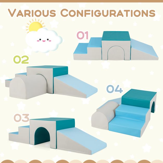 Made from high-density EPE foam and PU leather cover for safe play, this soft play set is ideal for homes, daycare centers, and schools.The hook and loop fasteners provide secure connections between foam blocks, ensuring a safe play surface for climbing, crawling, and sliding. Safety is guaranteed as the set complies withEN71standards, offering peace of mind for parents.It can foster your child's development through play with activities that stimulate creativity, motor skills, hand-eye coordination, and strength building. 4-PieceFoam Blocks Set:This lightweight and portable soft play set consists of a tunnel, slide,stepand half-moon, offeringendless possibilities of fun. This soft play set encourages kids to create new shapes and structures, ideal for indoor use in homes, daycare centers, and schools. Soft and Safe Play Surface: This foam block set uses high-density EPE foamthat provides excellent cushioning for children to climb, crawl and slide. Moreover, the hook and loop fastenersprovide convenient and strong connectionbetween foam blocks. Safety Certified for Peace of Mind:With your child’s safety as our priority, thisindoor soft toyset complies withEN71standards, offering you peace of mind. The robust construction and safe materials ensuresa hazard-free play environment for your toddlers. Develop Through Play:This soft foam structureset is perfect for variousactivities that stimulate your child's creativity, imagination,motor skills, hand-eye coordination, and strengthbuilding, supportinghealthy physical and cognitive development. Easy Maintenance:ThePU leather covers are not only soft but alsoeasy to remove with the zipper closure. Moreover, the waterproof surface makes cleaning a breeze.