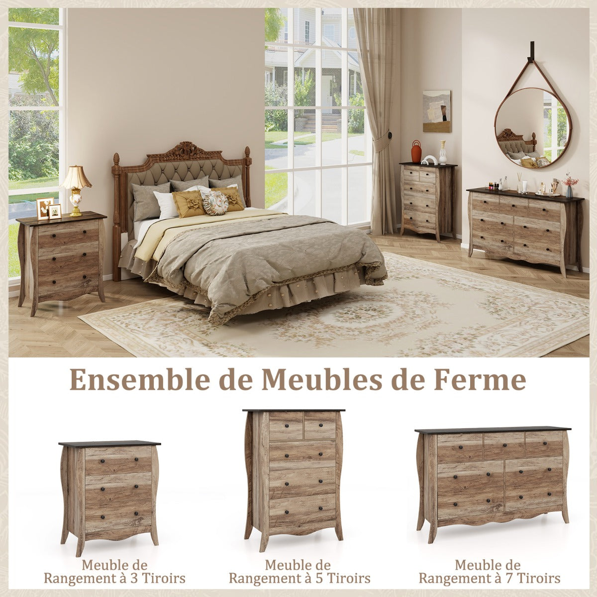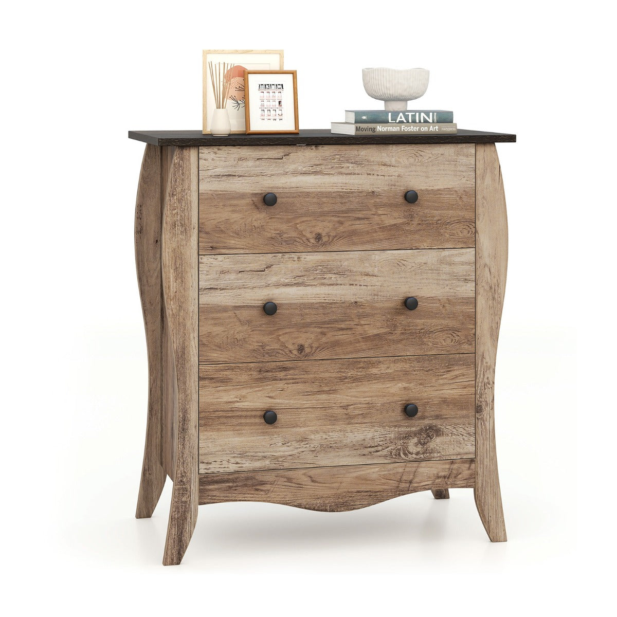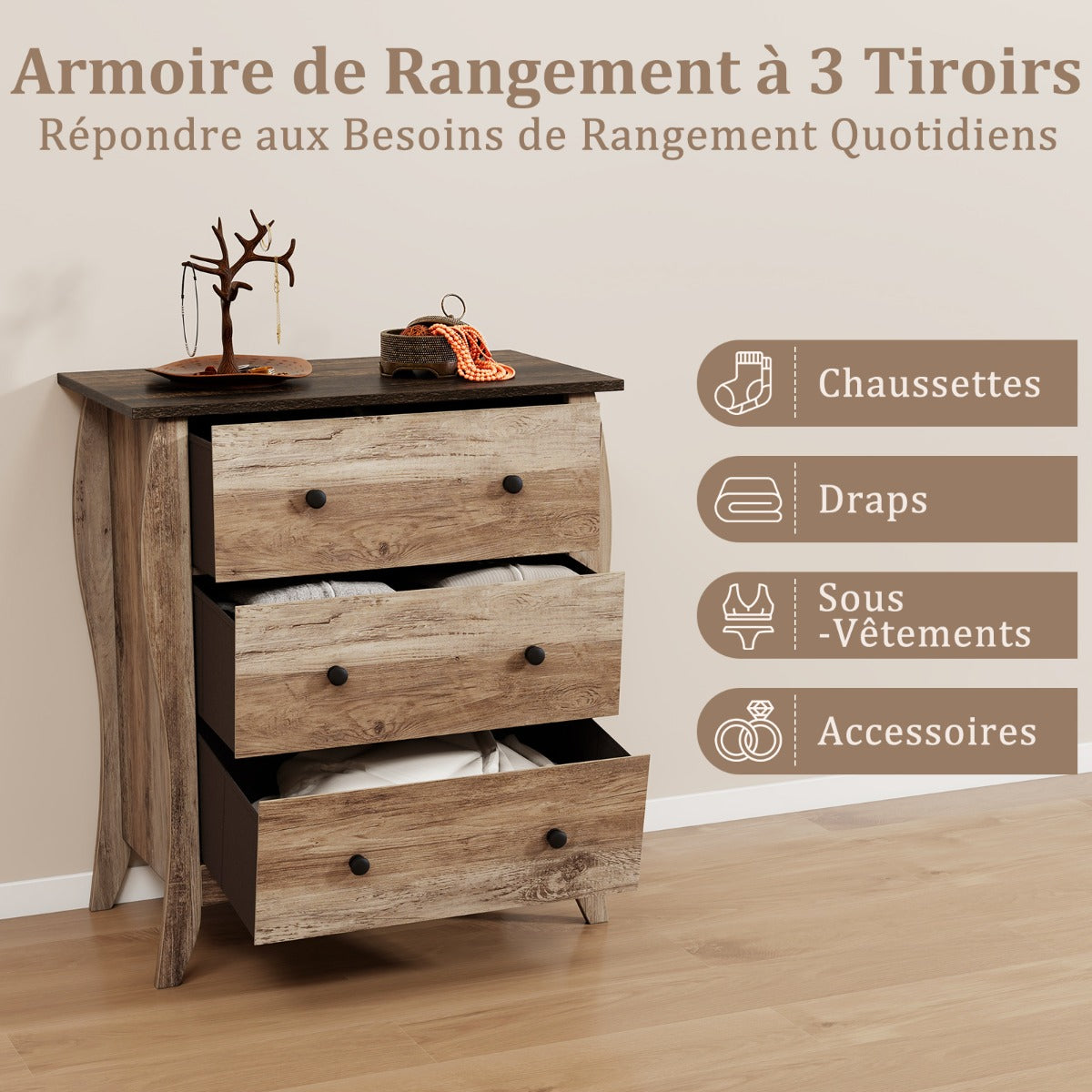 This3-drawer farmhouse dresser is not just a piece of furniture but a style statement that transforms any space with a blend of coziness and elegance. This stunning dresser offers roomy storage with 3 foldable drawers, optimized for easy installation and clutter-free living. Constructed with premium materials and designed for durability, it stands up to the rigors of daily use. Safety is never compromised with thisreliable anti-tipping kit. Versatile in nature, it is ideal for enhancing the look of your living room, bedroom, or hallway. Elevate your home’s style quotient effortlessly! Warmth of Farmhouse Elegance: The 3-drawer dresserboasts a curved silhouette and a wood grain finish for a cozy charm. It is a statement that brings the timeless appeal of farmhouse style into your home, making every room feel welcoming and lived-in. Spacious Storage for the Modern Home: Say goodbye to clutter with 3 generously-sized drawers that offer a vast capacity for storage. The foldable fabric material not only adds a sleek, modern touch but also makes the setup of the dresser a breeze. Quality Material andSturdy Construction: Crafted from high-quality materials and built with sturdy construction, this chest of drawers is designed to withstand the test of time. It’s a reliable companion that will serve you well for years to come. Safety in Mind: Rest easy knowing that your belongings are safe with the included anti-tipping kit. This thoughtful feature secures the dresser to the wall, significantly reducing the risk of accidents, and providing an extra layer of protection for your family. Versatility that Fits Your Lifestyle: This modern farmhouse dresser is a versatile piece that can adapt to any room in your home. Whether it is your living room, bedroom or hallway, this dresser is the perfect fit for your dynamic lifestyle.