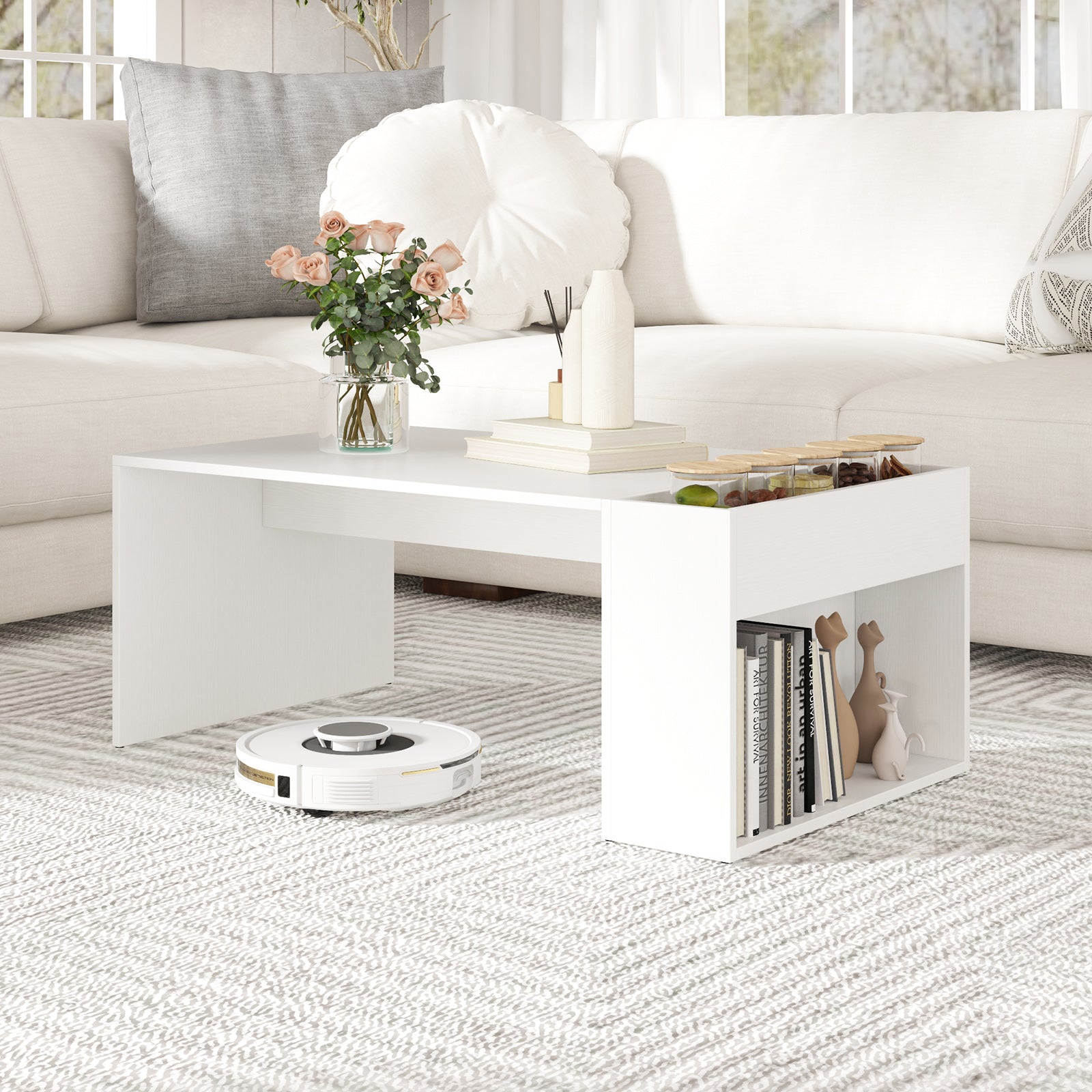 Give your place a fresh look with our Modern White Wood Grain Coffee Table, perfect for today’s stylish and practical living. This cool, minimalist table not only looks great with its sleek white finish and simple lines but also keeps your space tidy with its spacious surface and handy double-layer storage. Whether it’s for your living room or office, it’s built tough to handle daily use and cleverly converts from a coffee table into a dining table or desk when you need it. This piece is all about making your life easier and more stylish. Bring this must-have into your home or office and see how it transforms your space! Bullet Points: Modern Design:Featuring stylish white wood grain decoration, this coffee table incorporates modern aesthetic elements with clean lines and warm tones, adding a touch of simplicity and elegance to your living room or office space. Spacious Storage:This coffee table features a largetabletopand double-layer storage space, ideal for storing everyday items such as snacks, tissuebox, fruits, booksetc., keeping your space tidy. High-Quality Construction:The tabletop is made of waterproof board with perfectedge alignmentfor enhanced durability and water resistance. Non-slip foot padsat the bottom ensure stability and prevent movement, giving you peace of mind during use. Tunnel Design:The coffee table features a unique tunnel-shaped design that allows intelligent robotic vacuum cleaners to clean efficiently and conveniently, ensuring a hassle-free cleaning experience at home. Multiple Uses: Not only an elegant coffee tablebut also suitable for use as a dining table or office table. Whether for family gatherings, leisure coffee time, or work needs, it meets various lifestyle requirements.