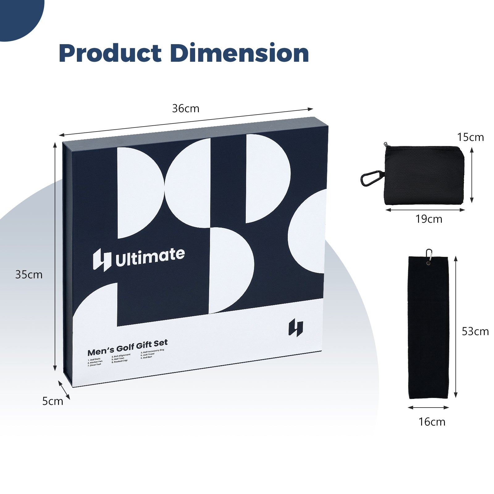 Color: White + Navy Material: Plastic, Polyester Cotton, Cowhide, Zinc Alloy Gift Box Dimensions: 36 cm x 35 cm x 5 cm (L x W x H) Golf Towel Dimensions: 53 cm x 16 cm (L x W) Storage Bag Dimensions: 19 cm x 15 cm (L x W) Golf Belt Dimensions: 135 cm x 3.5 cm (L x W) Divot Tool Dimensions: 8 cm x 3 cm (L x W) Golf Tee Dimensions: 7 cm x 1 cm (L x W) Net Weight: 1.5 kg Box QtyÔºö 1(May vary by batch) Package Includes: 1 x Magnetic Box 12 x Ball Tees 3 x Golf Balls 1 x Ball Alignment 1 x Golf Belt 3 x Marker Pens 1 x Divot Tool 1 x Golf Accessory Bag 1 x Golf Towel 1 x Peaked Cap
