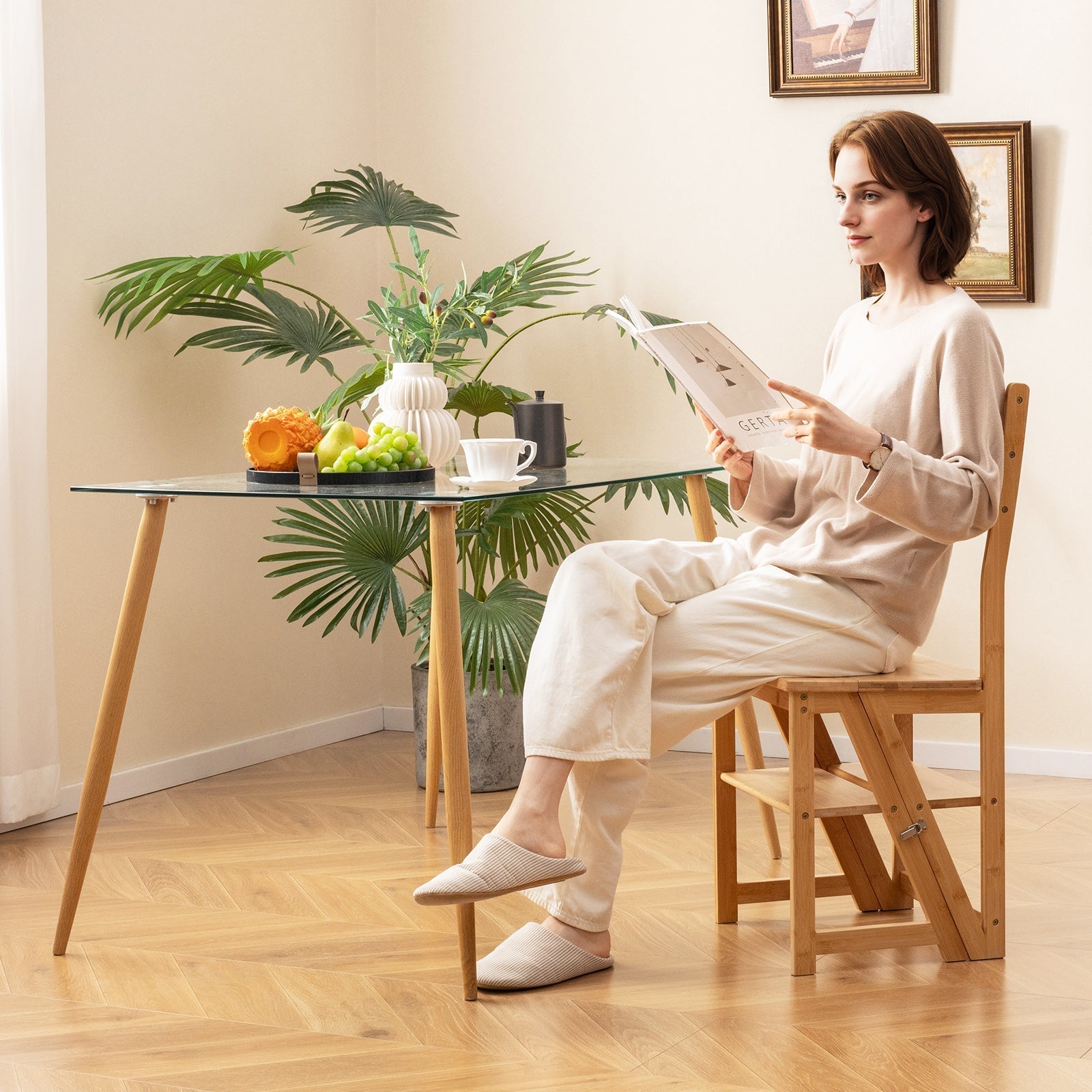 Make life easier with this folding ladder chair! This folding step ladder chair effortlessly transforms from a comfortable chair to a sturdy ladder, with secure locks ensuring your safety. Crafted from natural bamboo, this multifunctional furniture piece is resistant to wear, cracking, and fading, making it a reliable addition to your home. With a weight capacity of 150 kg, it can be used as a chair, ladder, plant stand, nightstand, or display stand, adding a touch of versatility to any room. The ergonomic chair features a high backrest and spacious seat for ultimate comfort, while the stable ladder boasts triangular structures and widened steps for a secure experience when reaching high places. Tool-free Conversion:Seamlessly transitioning from a high-back chair to a 3-step ladder, this folding ladder chair offers practicality and versatility,making it a perfect addition to kitchens, offices, libraries, and more. Natural Bamboo Material:Made from premium bamboo, this step stool chair combines sustainability with durability. The bamboo material boasts wear-resistant, anti-cracking and anti-fadingfeatures, ensuring a long-lasting addition to your home. Multipurpose Ladder Chair: This multifunctional furniture piece can be used as a seating option, step ladder, plant stand, nightstand, or display stand, adding creativity and style to any room. It has a weight capacity of 150 kg. Chair Designed for Comfort:The ergonomic design of this chair features a high backrest and spacious seat for ultimate comfort while seated. Equipped with secure locks and non-slip foot pads, this chair is safe to sit in. Secure and Stable Ladder: The stable triangular structures ensure the ladder's stability, making it reliable for reaching high places. Additionally, the widened steps and sturdy connectors provide a secure experience when using the ladder.