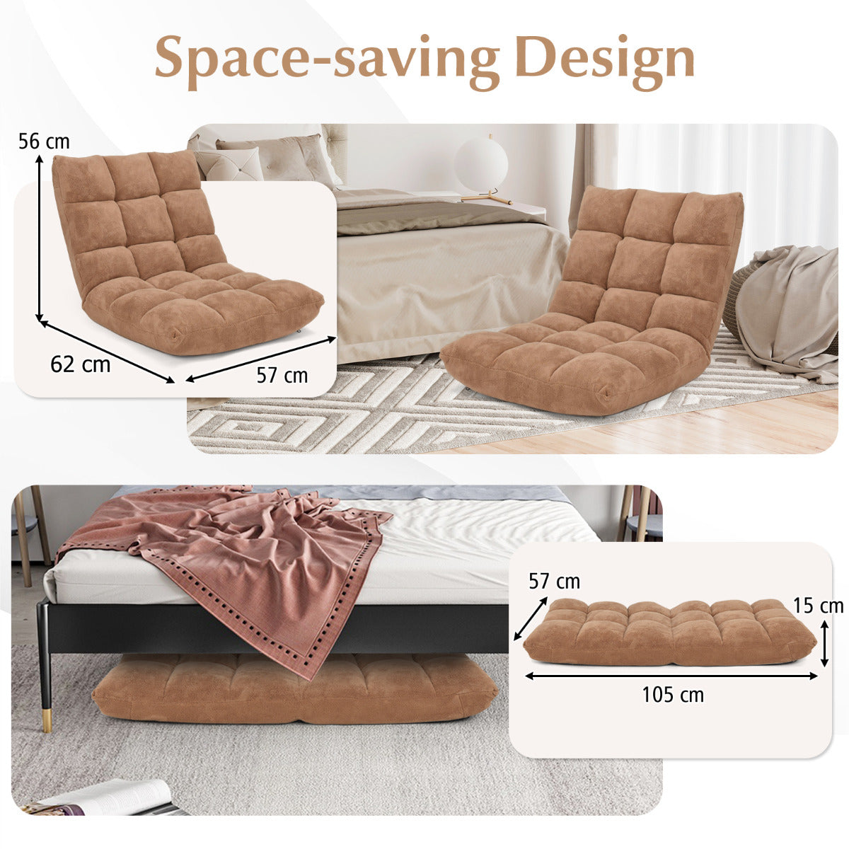 Create a cozy spot at home with this floor chair! Covered with skin-friendly coral velvet and padded with high-resilient sponge, this floor chair offers you wonderful sitting experience, just as lying in the soft sky. You can also adjust the backrest to 14 different positions to read books, watch TV, play games, etc. The sturdy steel frame and 200 lbs weight capacity leave you no worry about deformation or tipping over. When not in use, just lay it flat. The compact size will fit perfectly into the limited space under your sofa or bed. 14-Position Adjustable Backrest: This floor chair is designed with an adjustable backrest which allows you to customize the angle from 0 degree to 84 degrees to satisfy your different position needs. Even better, the solid and flexible steel adjuster offers you smooth and effortless operation. Premium Material for Optimal Comfort: Filled with ultra thick and high-density sponge, this floor gaming chair provides comfortable and reliable support when you sit on. Meanwhile, the coral velvet cover renders you skin-friendly and warm touch, further improving coziness. Sturdy Metal Frame and Durable Oxford Cloth: The frame of the floor chair is composed of heavy-duty steel, which ensures sturdiness and strong bearing capacity up to 200 lbs. Besides, the base of the chair is covered with non-slip and wear-resistant 300D Oxford cloth for better using experience and longer service life. Applicable to Various Occasions: Combing comfort and style in one, this multipurpose floor chair is the perfect solution for any place that needs a seat. Either for meditation, reading or for watching TV, playing games, the floor chair is always a good companion. No Assembly and Easy Storage: This adjustable floor chair requires no assembly. When you receive the package, just unwrap it and then it's ready to use. Additionally, there is no need to worry about storage. You can lay the floor chair flat and tuck it away under the sofa or bed.
