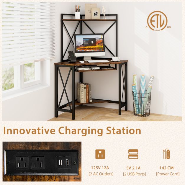 Corner Computer Desk with Hutch Storage Shelves and Keyboard Tray-Rustic Brown