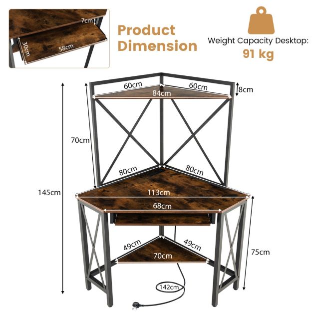 Color: Rustic Brown + Black/White + Golden Material: Engineered Wood, Metal Overall Dimension: 113 x 75 x 145 cm (L x W x H) Size of Desktop: 80 x 80 cm (L x W) Size of Top Shelf: 60 x 60 cm (L x W) Max Length of Top Shelf: 84 cm Height of Hutch: 70 cm Height of Top Baffle: 8 cm Max Length of Desktop: 113 cm Height of Desktop: 75 cm Length of Desktop Front: 68 cm Size of Keyboard Tray: 58 x 30 cm (L x W) Distance Between Keyboard Tray and Desktop: 7 cm Size of Bottom Shelf: 49 x 49 cm (L x W) Max Length of Bottom Shelf: 70 cm Length of Power Cord: 142 cm Load Capacity of Desktop: 91 kg Load Capacity of Each Shelf: 23 kg Load Capacity of Keyboard Tray: 14kg Net Weight: 21 kg Package Includes: 1 x Corner Desk with Hutch 1 x User Guide