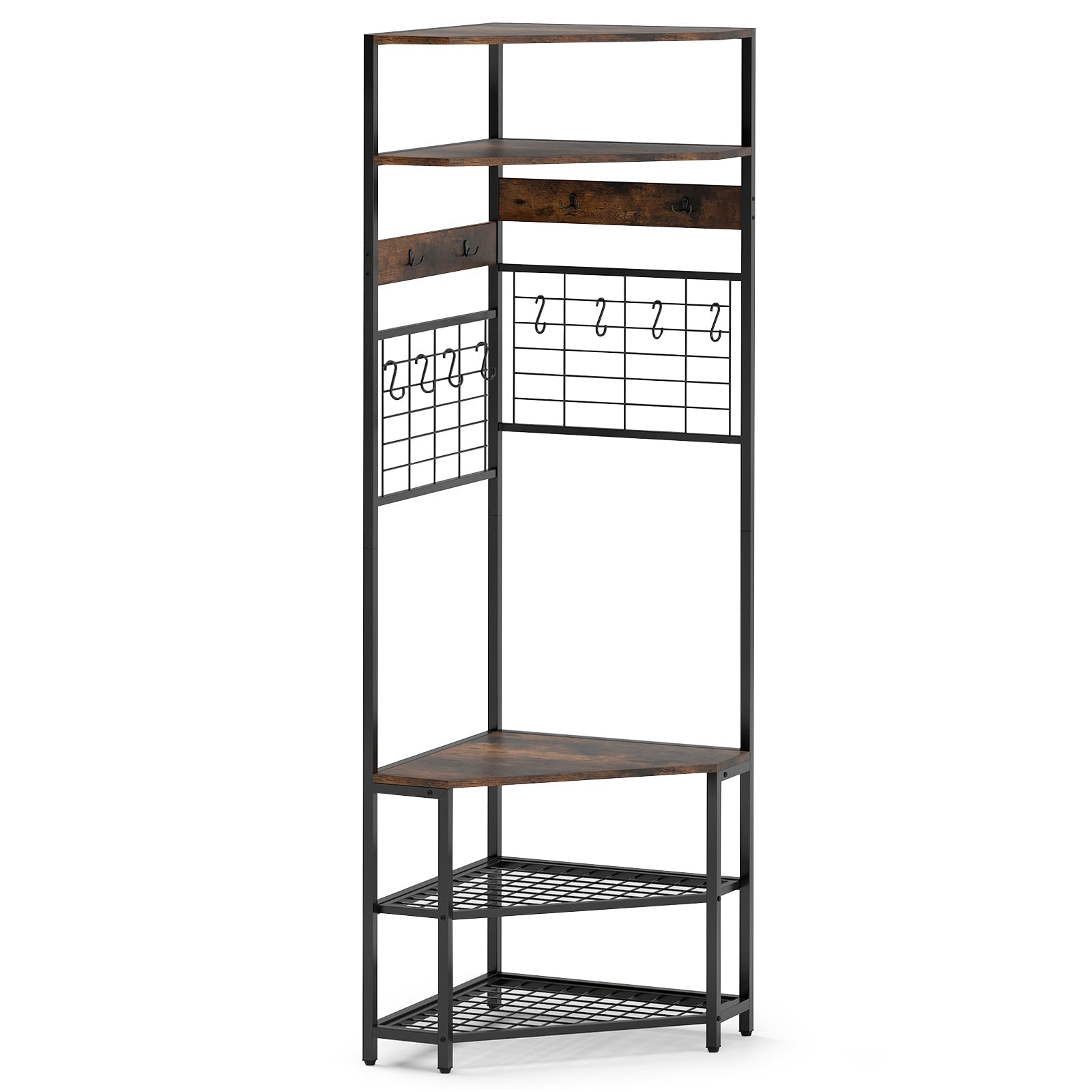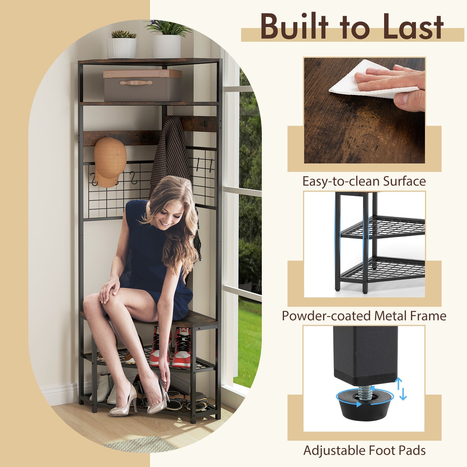 Corner Hall Tree 5-Tier Coat Rack with Shoe Storage Bench-Rustic Brown