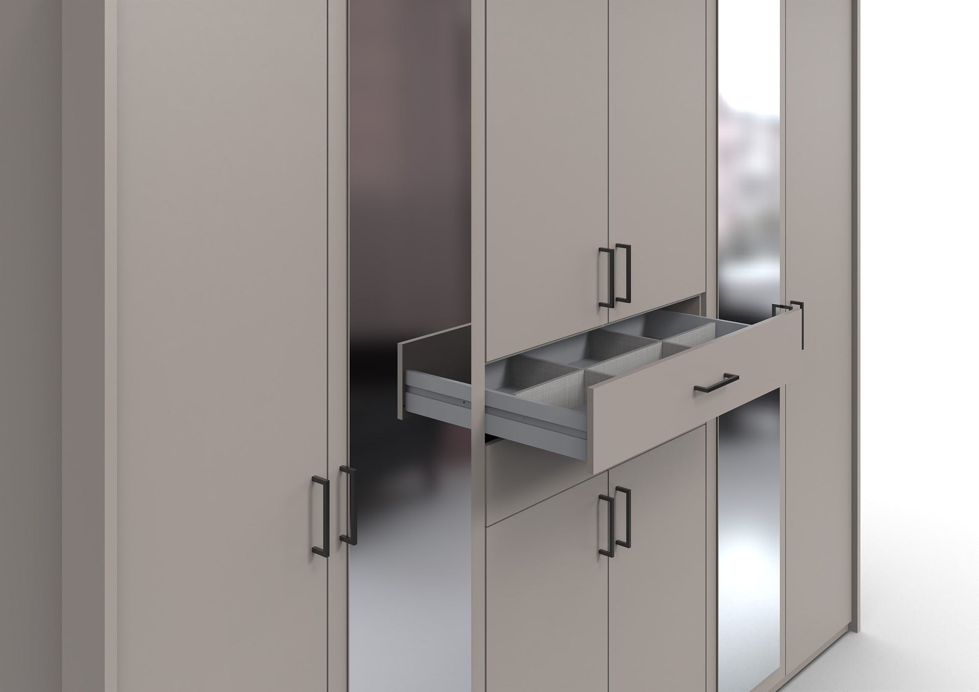 The DOCKER 5 Door wardrobe has a sleek and contemporary look,finished with Mirrored door.The wardrobe has trendy handles which gives the wardrobe a modern look .The wardrobe has two hanging rail and a top storage shelf and it has total 5 shelves divide in three section.