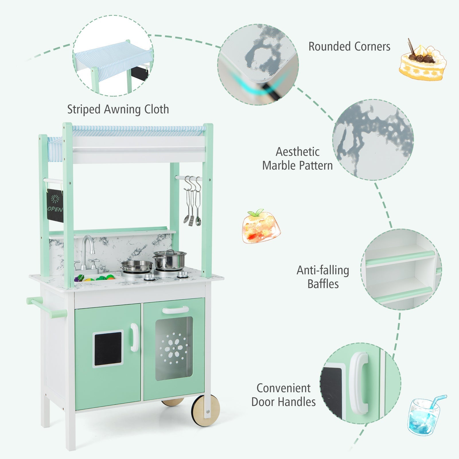 Specifications: Colour: Green Materials: Pine Wood, MDF, Non-woven Fabric, Stainless Steel, Plastic Product Dimension: 68 x 39 x 120 cm (W x D x H) Height of Counter: 60 cm Diameter of Wheels: 13 cm Net Weight: 15 kg Recommended Ages: 3+ Years Old Package Includes: 1 x Double-sided Play Kitchen 1 x Apron 1 x Chef Hat 1 x Blackboard 1 x Pot 1 x Pan 4 × Vegetables 3 × Hanging Hooks 2 × Spoons 1 x Spatula 1 x Knife 1 x Plate 1 x Instruction Box Qty: 1(May vary by batch)