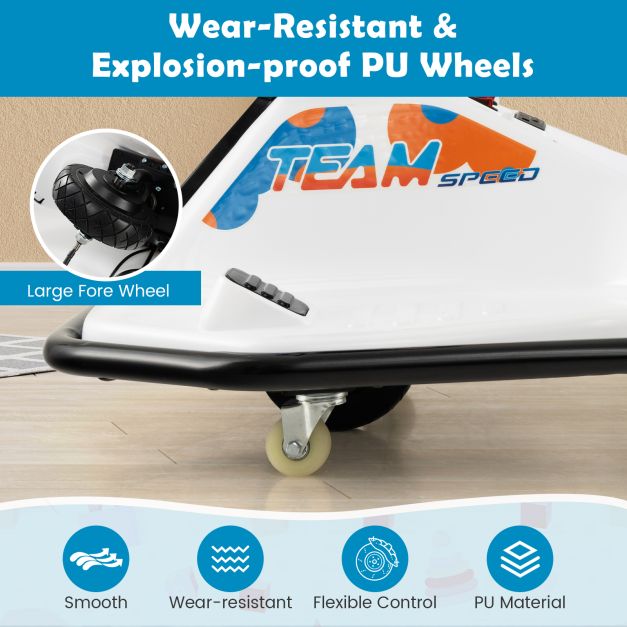 With 4 PU universal wheels and 1 rubber drive wheel, your little racer over 3 years old can pull off impressive drifts. The 24V battery and motor enable kids to enjoy a driving speed ranging from 3 to 8 kph. The LED headlight, wireless connection, radio, USB option, and music will also help your little one to have unforgettable memories. It is also designed with 3 flags. To ensure driving safety for your child, it is equipped with a slow start and slow stop function and adjustable safety belt. It has 5 wear-resistant and silent wheels for kids to smoothly drive on cement roads, brick roads, wood floors, or asphalt roads. It also features a design keeping kids in mind, such as the protective poles and decorative stickers. If you are looking for a electric drift car like this, do not hesitate to place an order! Thrilling Drifting Experience: Our 24V kids ride on drift car features 4 flexible universal wheels and 1 large drive wheel for 360-degree spin. Your little racer can freely change direction and achieve acceleration through the steering wheel and foot pedal. It has 2 speed options (high or low) for kids. Safe andComfortable Driving: The foot pedal is designed with a safe slow start and slow stop function to avoid the risk of sudden acceleration or emergency braking. The wide seat with safety belt keeps your little one secure. The seat supports up to 60 kg. Protective metal poles provide added safety. Fun Entertainment for Kids: The LED headlight, wireless connection, radio and music will enhance the enjoyment of your child’s adventures. The USB port can connect electronic devices to play kid’s favorite songs, adding extra fun and amusement. Durable andReliable Materials: This drift car is made with premium PP and metal materials, making it strong enough to accompany your little one for years. The PU casters and rubber drive wheel also ensure great wear resistance for a smooth driving experience. Perfect Drift Car for Toddlers: Our electric drifting car will be a nice gift for kids over 3 years old. Featuring 24V brushless motor and 24V 7AH battery, this toy car allows for a long-lasting playtime and 2-5 mph speeds. With 3 flags included, your toddler can fully enjoy the racing fun!