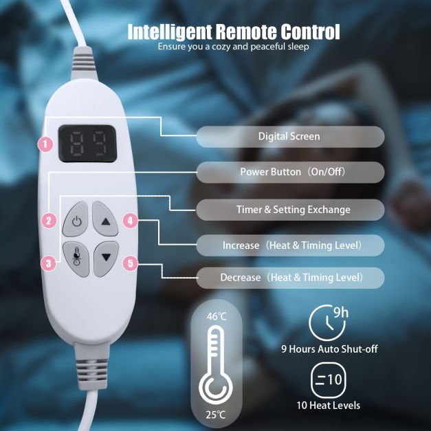 The electric blanket is definitely the ideal gift for yourself or your family in cold winter day. With the high quality PTC heater, you can be immediately wrapped in an even heat flow. An easy-to-use remote control enables 10 adjustable settings to meet different people's needs. In addition, the 9-hour automatic shut-off feature will improve your sleep efficiency. Besides, with overheat and overcurrent protection, you don't have to worry about safety with our heating blanket. What's more special is that this comfortable heating blanket can be used on both sides, one side is smooth and warm faux rabbit velvet, and the other side is light sherpa fleece. Whether in the bedroom, library or office, it will work well to make you feel warm. And this electric blanket can be hand-washed or machine-washed for easy maintenance. Safe First andPowerful Heater: Safety always comes first, our reversible electric blanket features overheat and overcurrent protection. On top of that, we have used a highly efficient PTC heater, which transfers heat to your whole body so you can feel the warmth faster and more evenly. Customize Your Desired Settings: Considering the needs of different people, our electric blanket can set the temperature from 25-46℃ in 10 levels. In addition, you can preset the auto shut-off time within 9 hours so that you can enjoy a sound sleep. And all the settings can be easily achieved by the smart controller. Dual-side Premium Material: One of the outstanding advantages of our heating blanket is that it uses different materials on both sides, one side is smooth and warm rabbit fleece, and the other side is comfortable and light sherpa fleece. The high quality material will bring you the ultimate luxury enjoyment. Warm-hearted Gifts: Thanks to its excellent heating effect, our electric blanket is friendly to people with cold hands and feet or the elderly. In addition, the concise appearance and comfortable material of our electric blankets will make them feel wrapped in clouds and enjoy a relaxing experience. Suitable for Various Scenes: Our heated reversible blanket is sure to keep you company through many cold winter days. Whether you read, work, study, watch TV or sleep, it will bring you instant warmth in your daily life. In addition this electric blanket can be machine washed and hand washed. Note: Please unplug the controller before washing.