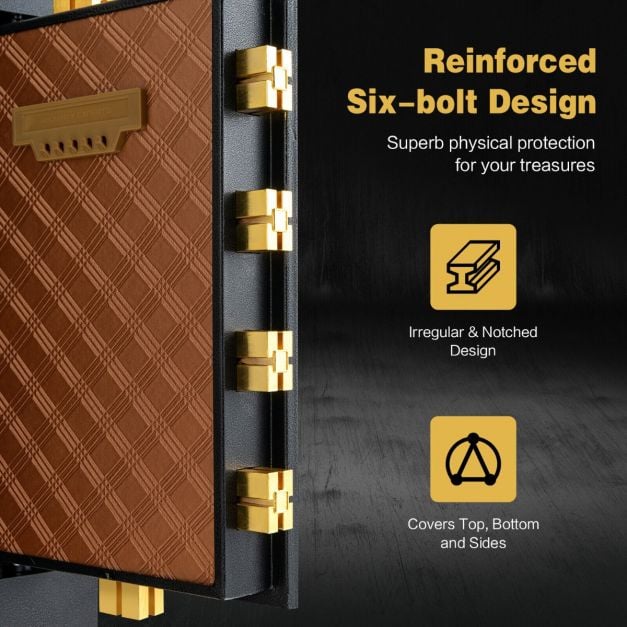 Protect your property with thetrustworthy safe box!Made of high-quality steel and solid live-locking bolts, the safe box provides superior protection and long-lasting service life. The safe box is also equipped with a sensitive alarm system which will beep and flash to alert after incorrect attempts of entering code or violent vibration. Plus, the outstanding anti-peeping technology adds extra security. Therefore, you can trustingly store your precious items including cash, watches, passports, electronic products in this safe. Besides, the convenient digital keypad, master keys, emergency keys and an Android Micro-USB interface allows you to open the safe box no matter the batteries run out or you forget the password. Furthermore, with the 2 pre-drilled holes and 2 expansion bolts, you can also install the safe box to the wall or shelf to enhance security.If you are looking for such a product, don't hesitate to place an order! 3 Ways to Open: This electronic safe box comes with 2 master keys, 2 emergency keys and an Android Micro-USB interface. For daily use, you can enter your personal password and turn in the master key. If you forget the password, you can use the master key plus the emergency key. When the batteries run out, you need to use your own portable charge, password and the master key. Large Storage Capacity: This lock safe is able to accommodate your multiple valuables, such as cash, jewellery, passport, and cameras. Besides, the internal shelf can be adjusted to meet your needs for placing different products. In addition, there is a separate safe inside the bigger safe, which can set the password separately to provide additional protection for your products, while the interior surface of the smaller safe is fully covered with leather so as to protect your property from wearing. Sensitive Alarm System and Anti-peeping Technology: The safe security box is equipped with an intelligent alarm system that will be activated with beep and flashing red light after 3 continuously wrong password entries or violent vibrations. Besides, it’s worth mentioning that the anti-peeping technology allows you to enter any number before and after the correct code to prevent password guessing. Secure andDurable Steel Construction: The bigger safe is made of solid steel, and equipped with 6 notched bolts, which are pry-resistant and reinforced. The bolts cover the top, bottom and side of the bigger safe’s door and provide superb physical protection for your belongings. The smaller safe is made of pry-resistant carbon structural steel, ensuring great sturdiness and long-lasting durability. In addition, the smaller safe security box also features 4 solid live-door bolts and a thick door panel to offer excellent secure performance. Convenient Installation: We will provide you with 2 expansion bolts so that you can mount the security cabinet to the wall in your closet, shelf or wardrobe. Additionally, the anti-slip foot pads add great stability. This compact and secure safe box is perfect for the office, home, mall checkout counter, etc.