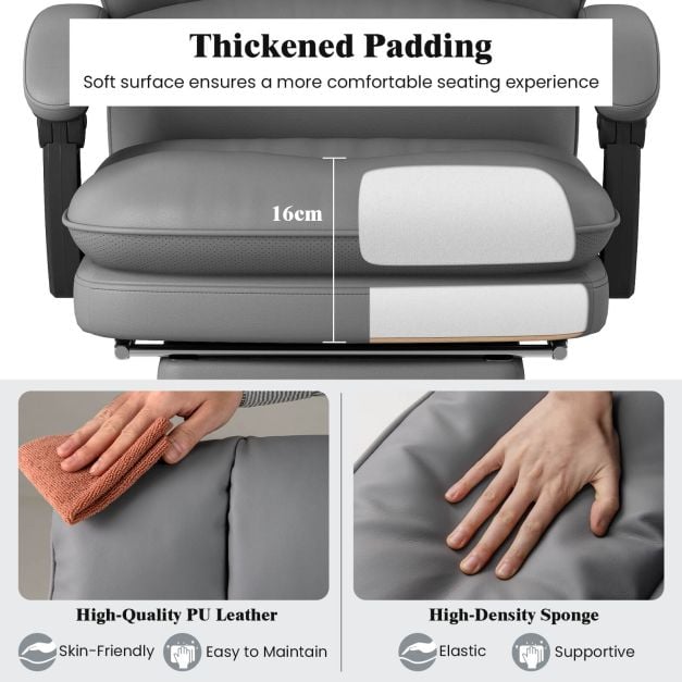 The home office features premium PU leather and elastic sponge padding, enabling you to sit more comfortably. In addition, this chair boasts a 155° reclining backrest that allows you to set your desired backrest angle. Its padded linkage armrests and retractable footrest help you maintain a healthy posture for optimal relaxation. Easily adjust the chair's height and enjoy smooth swiveling movements with its swivel seat. Built to last, this executive task chair boasts a sturdy metal base and gas rod, supporting up to 136 kg. Glide effortlessly on universal wheels for swift mobility in any workspace - whether working, studying, or gaming. More user-friendly details await your discovery. If you are looking for such a product, do not hesitate to buy it! Luxurious Comfort Experience: The office chair is crafted from premium PU leather and high-density sponge, offering a luxurious surface that is cozy and easy to clean. Moreover, the soft seat features a thickened padding and delivers great comfort. Customized Comfort Solutions: Thanks to the 155° reclining backrest, the computer chair allows you to lean back comfortably and unwind. Also, the padded linkage armrests and retractable footrest provide ergonomic support for your arms and legs. Adjustable Swivel Design: Tailored for people of different heights, the executive chair features a seamless adjustable seat height ranging from 51 cm to 58 cm. The 360° swivel design ensures smooth movement in any direction, making it easy to reach for documents or engage in collaborative work. Heavy-Duty Construction: Engineered for long-lasting reliability, the computer desk chair is supported by a 5-claw metal base that provides a generous load capacity of 136 kg. The robust gas rod ensures smooth height adjustments, allowing you to find the perfect seating position with ease. Smooth Mobility: The 70 x 65 x 107-114 cm (L x W x H) home office chair is equipped with universal wheels that glide effortlessly across various surfaces. This chair is the perfect choice for any spaces - whether you're working, studying, or gaming - offering a versatile solution that adapts to your every need.